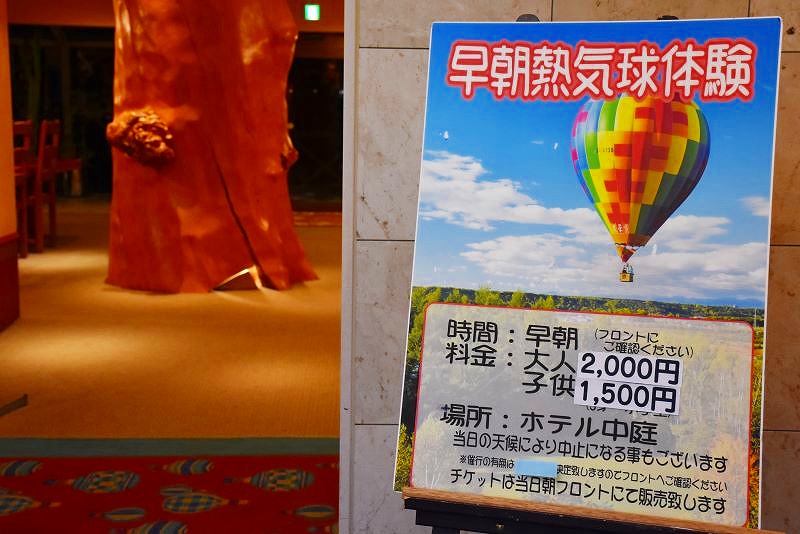 「個人では乗れないの?」とがっかりしないでください。チャンスはあります。熱気球を飛ばす予定の日は、個人参加も受け付けてくれます。ホテル内のこの看板が目印です。