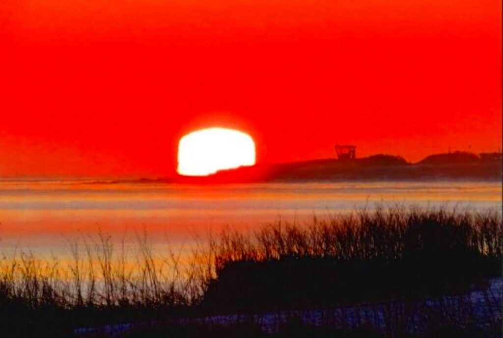 冬場の日の出岬では時折、冬の冷たい空気と海水の温度差により一種の蜃気楼現象が起き、太陽が四角く見えることがあります。条件が整わなければ目にすることができない、この「四角い太陽」。見られるとその日一日がいい日になるかも!