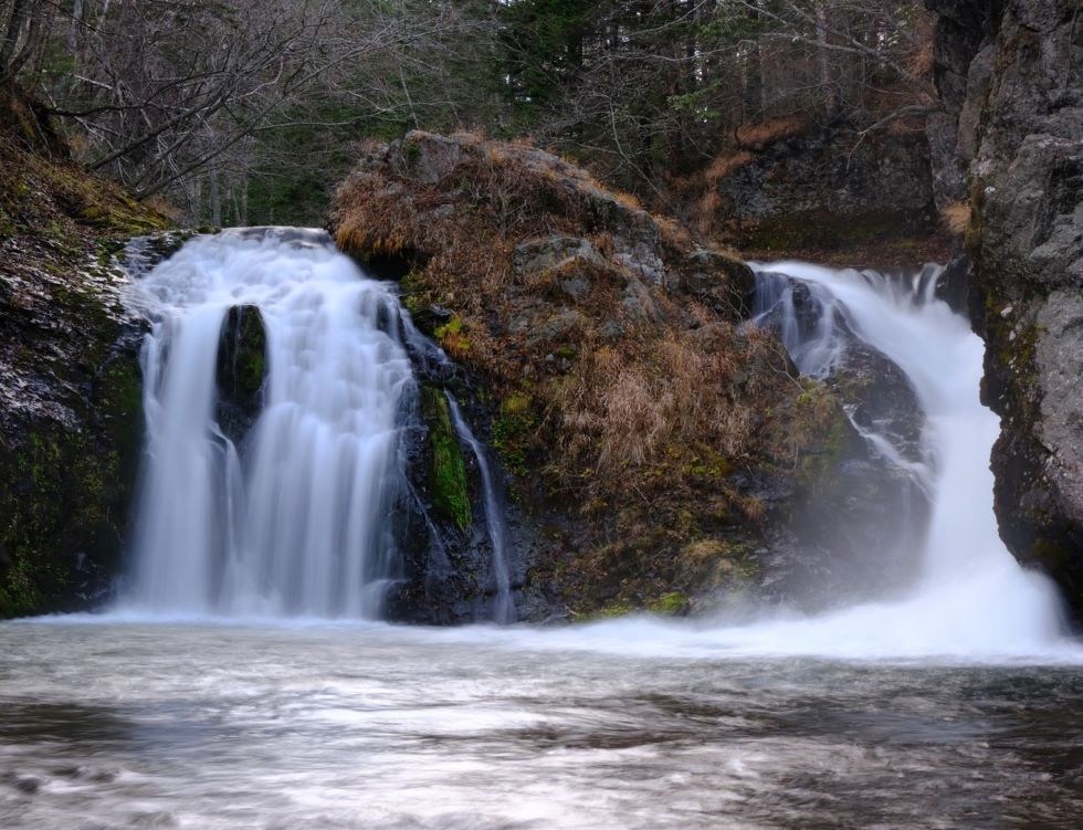 最後は「巨岩(おおいわ)の滝」。足寄の西の端、芽登地区にある滝で、秘湯「芽登温泉」よりも更に奥に入ると大きな看板が出てきます。糠南川の急流が2つに分かれ落ちる大迫力の滝です。
