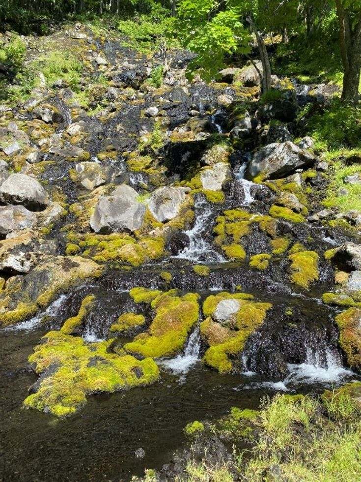 道道468号線白糸地区にあるのが「白糸(しらいと)の滝」。油断すると見逃してしまいそうな道道脇の看板を入り、車を停めて少し歩くと12メートルの美しい滝が姿を現します。ここは川ではなく、上の部分から水が湧きだして流れ落ちる珍しい滝です。