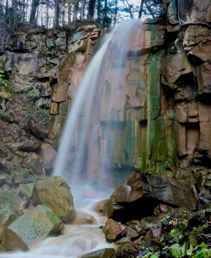 まずは、マンガン酸化物生成現象が地上で見られる世界で唯一の貴重な場所。国の天然記念物にもなっている「オンネトー湯の滝」です。その名の通り、湧きだした温泉が流れ落ちる高さ30メートルの滝です。