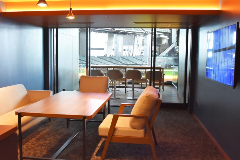 1塁側のクラブラウンジからは、窓越しに日ハムの記者会見場を見ることができます。座席単価は1万3000円~2万7000円(シーズンシート価格は113万~156万円)