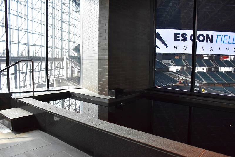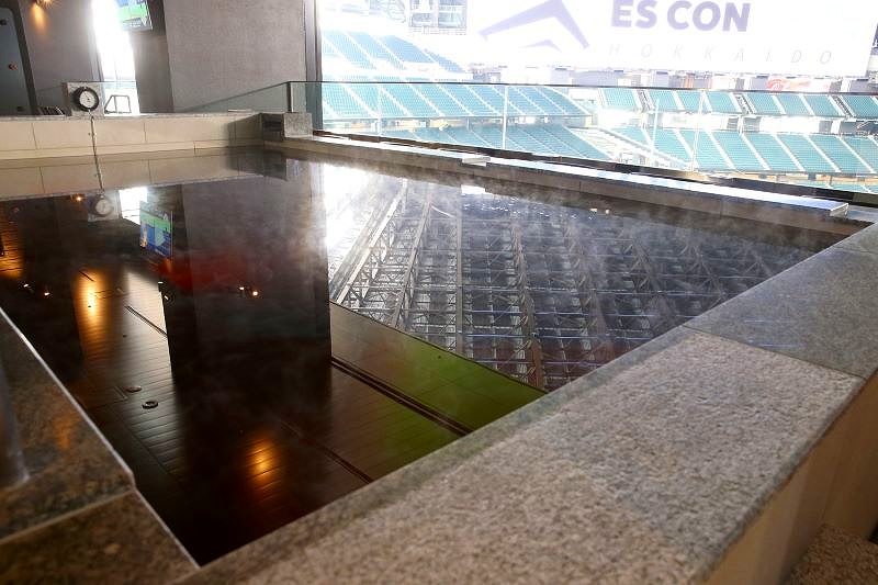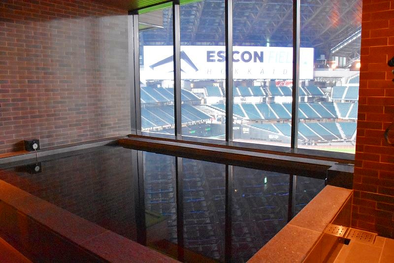 フィールドを一望できる球場内天然温泉とサウナです。温泉は地下1300メートルから汲み上げたモール温泉です。