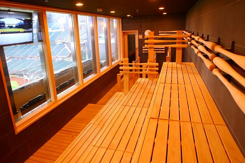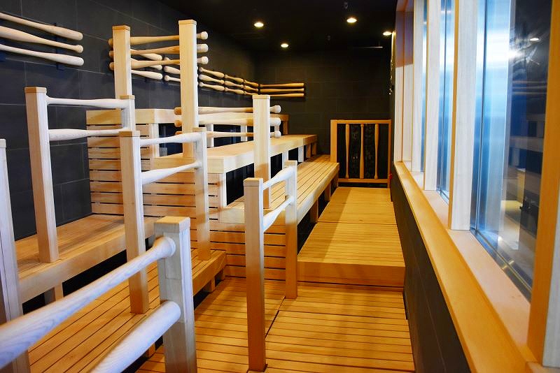 サウナに使われている木材は、バットと同じ素材のアオダモです。手すりがバットの形になってますよ。