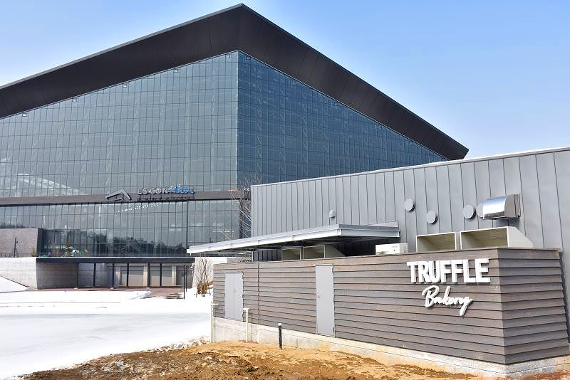 まずは、エスコンフィールドのガラス張りの壁面のすぐ前にある山小屋風の建物が「THE LODGE」です。