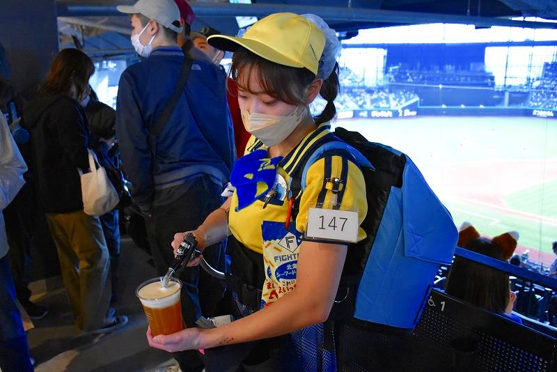 サーバーを背負った売り子さんや、球場内の一部飲食店で販売しているクラフトビールは、醸造所オリジナルの3種類のうち、フラッグシップビール「Play Ball! Ale」です。他の種類が飲みたい方は、こちらで買い求めてください。