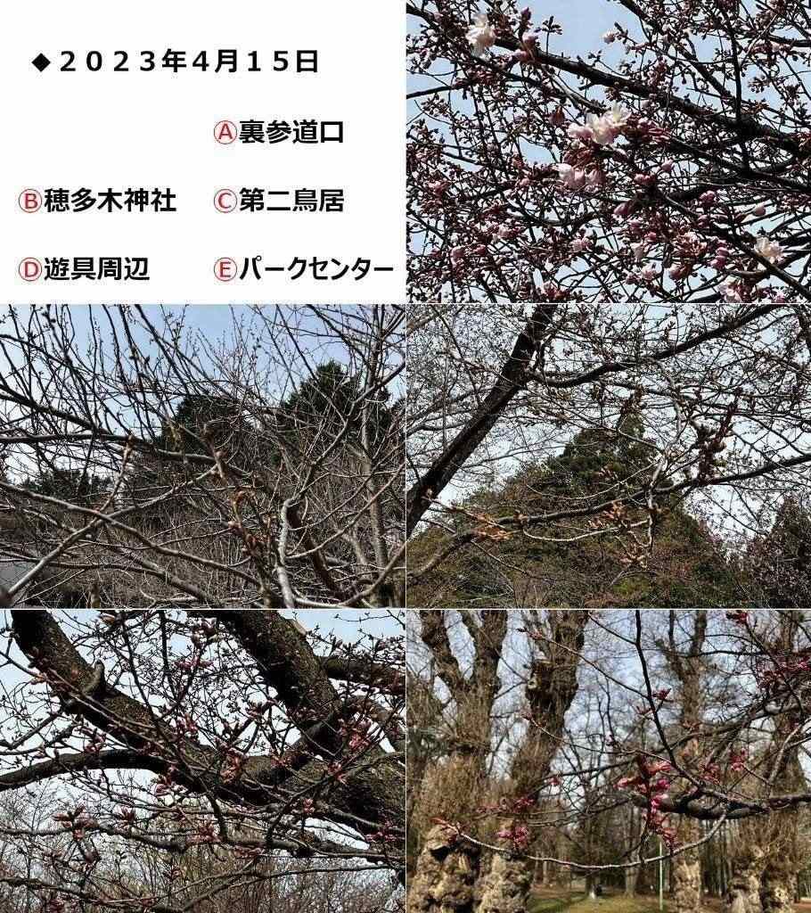 ▽4月15日 北海道神宮の裏参道口・第三鳥居前では開花が進む