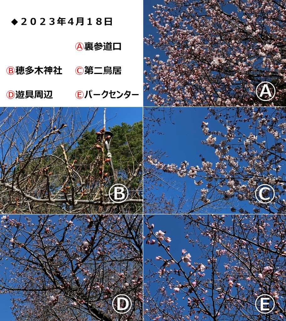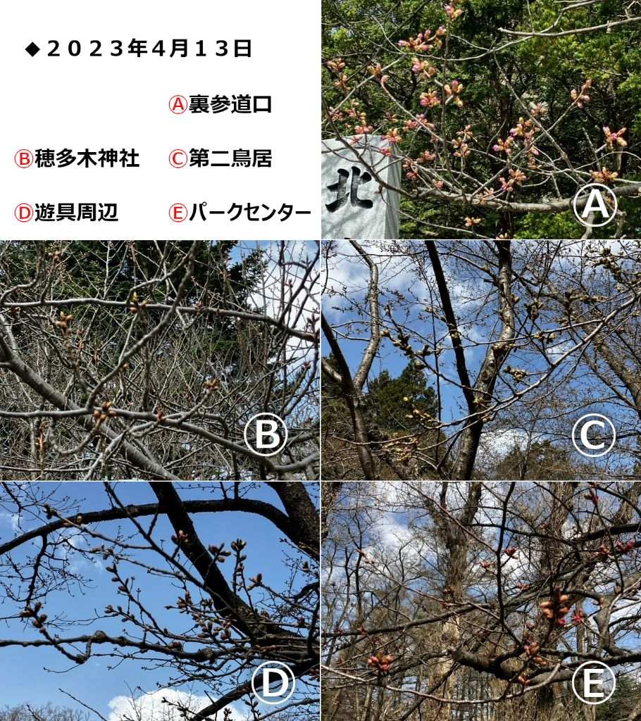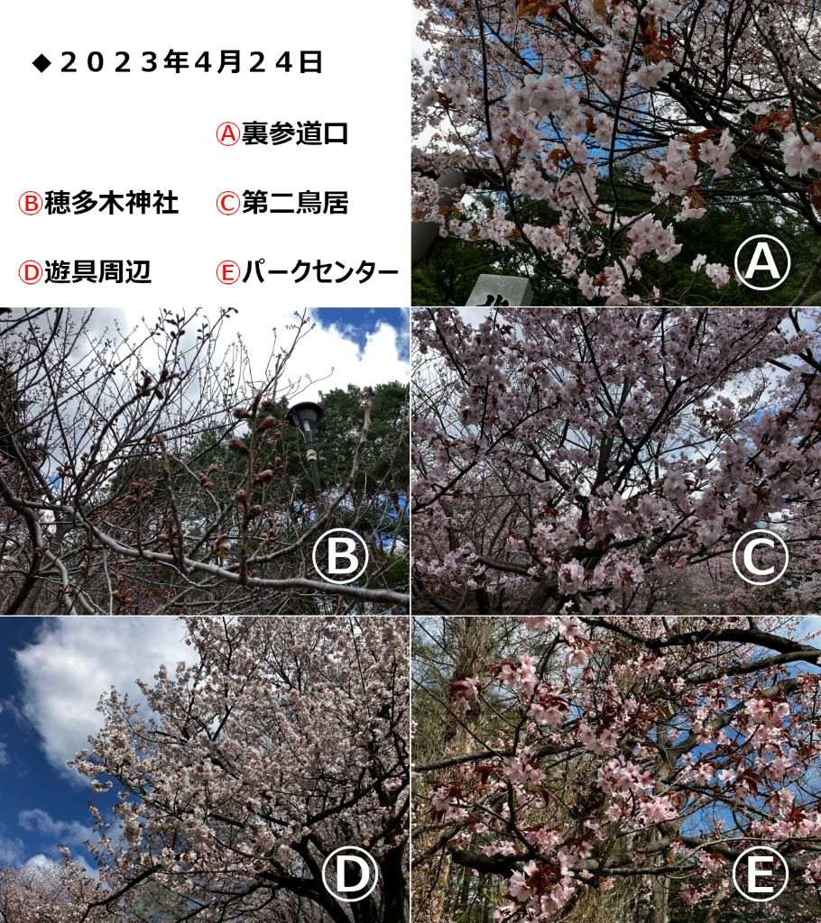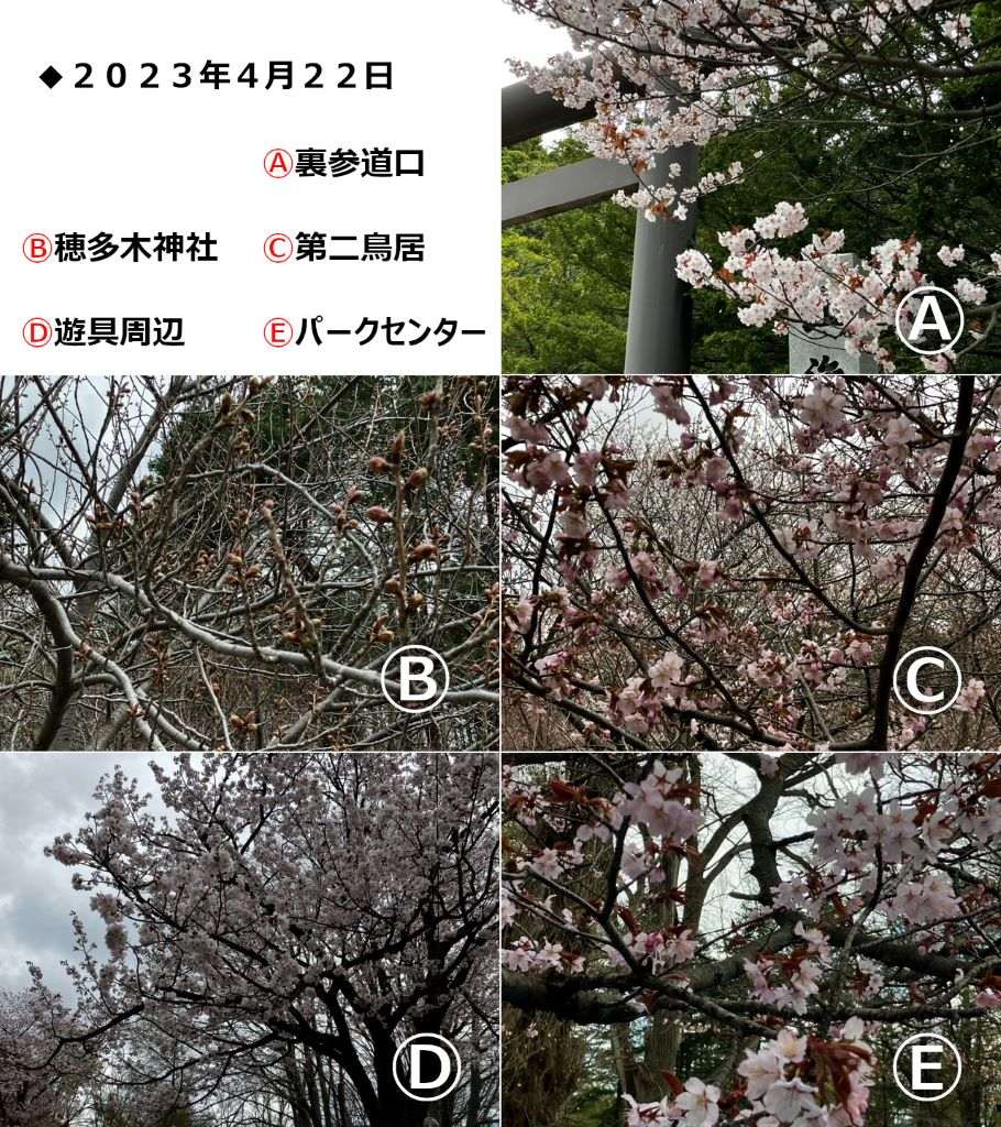 北海道神宮はおよそ1,100本、円山公園には120本の桜がありますが、桜の種類や植えられている場所、日当たりなどで、開花・満開の時期が変わってきます。今回は北海道神宮・円山公園の中から5つのスポットを選び、開花情報を写真&ひと言コメントで随時ご紹介していきます。
