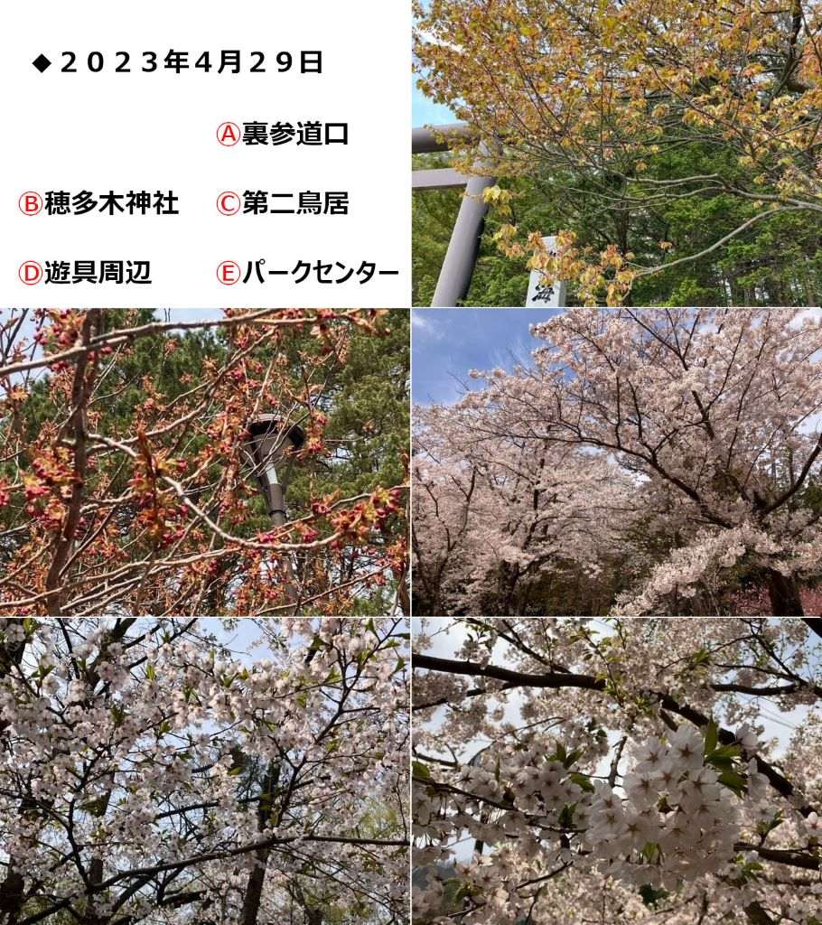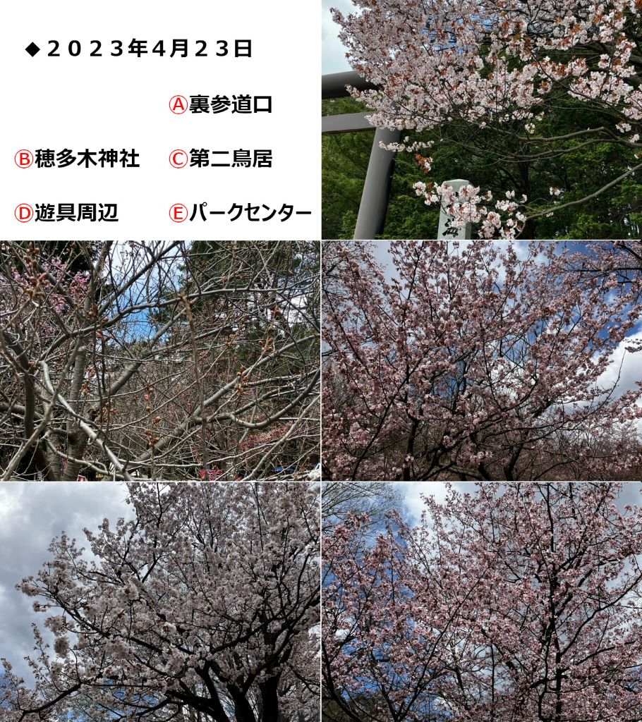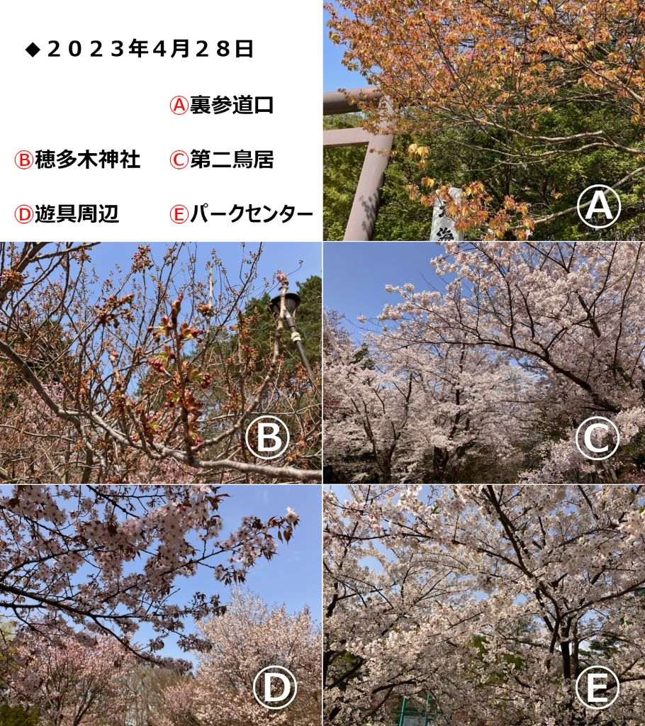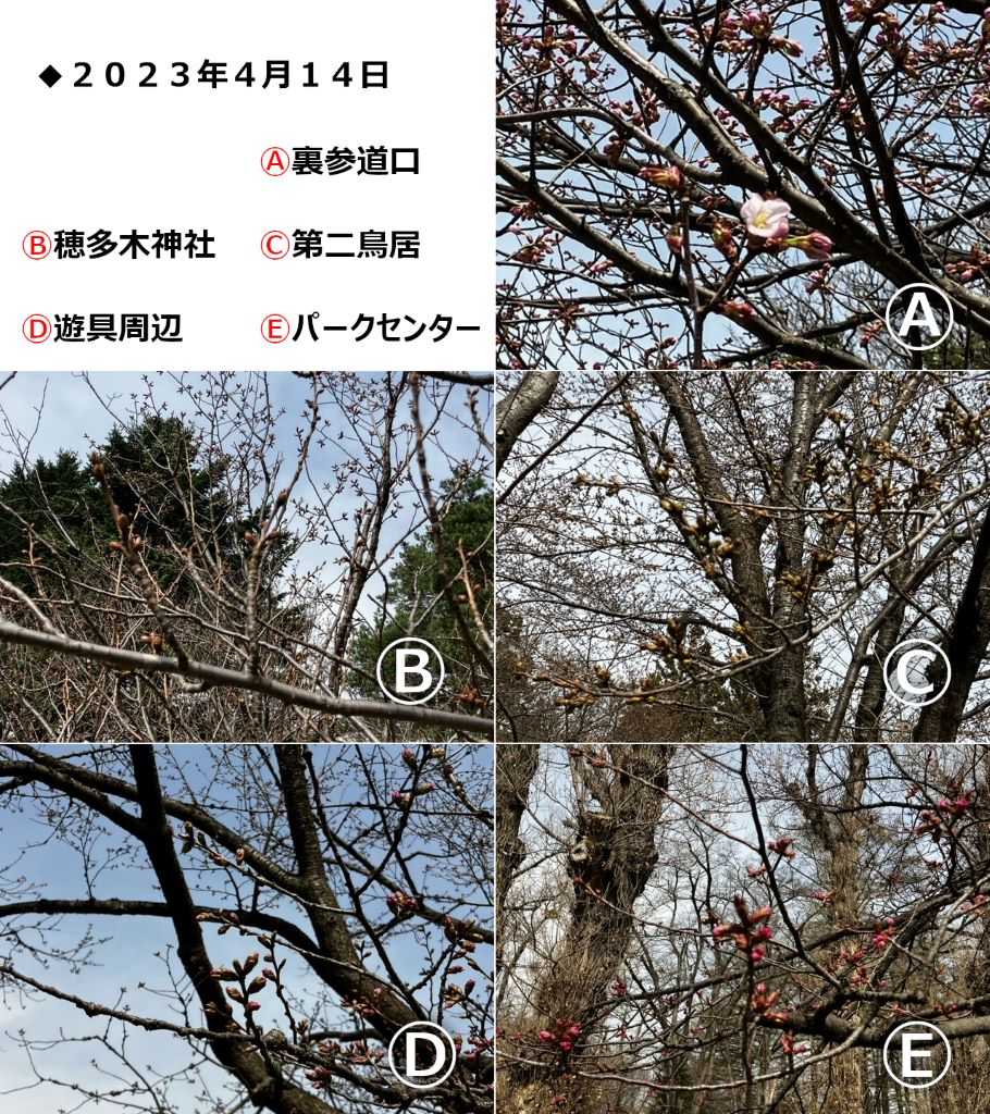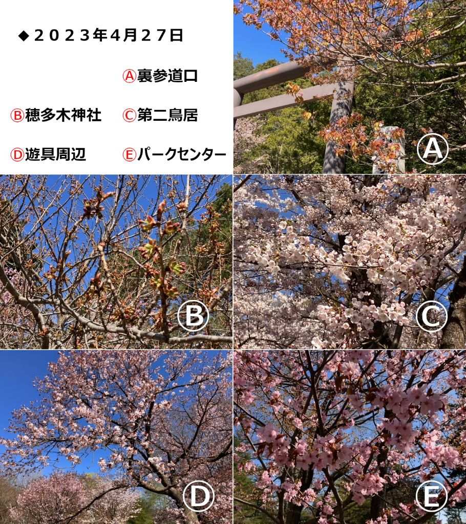 北海道神宮はおよそ1,100本、円山公園には120本の桜がありますが、桜の種類や植えられている場所、日当たりなどで、開花・満開の時期が変わってきます。今回は北海道神宮・円山公園の中から5つのスポットを選び、開花情報を写真&ひと言コメントで随時ご紹介していきます。