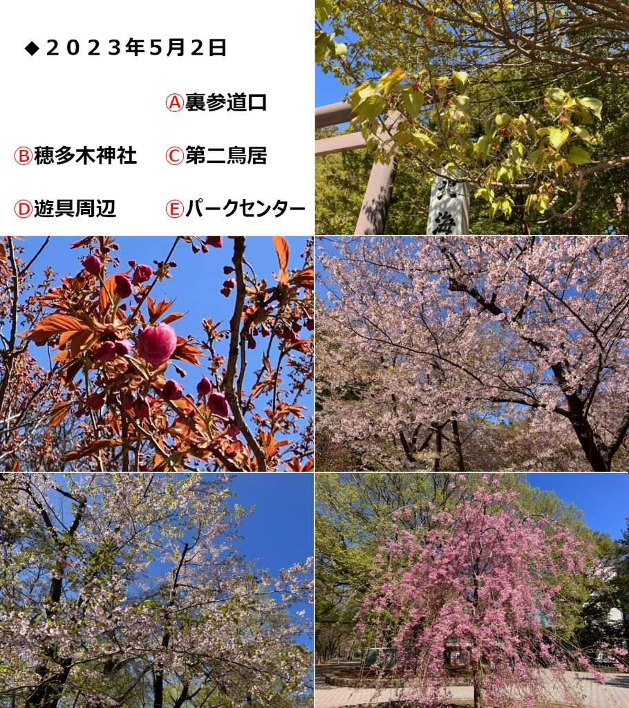 この辺りでもエゾヤマザクラやソメイヨシノなど大半の桜が散ってしまいましたが、パークセンター前のシダレザクラだけ辛うじて咲いていました。また公園南側の坂下野球場のソメイヨシノも散ってしまいました。今年は桜の開花が早かったので、残念ながらゴールデンウイークの後半にはメインのエゾヤマザクラとソメイヨシノはほぼ散ってしまいました。一方、北海道神宮の一部ではトリを飾るヤエザクラがまだきれいに咲いています。