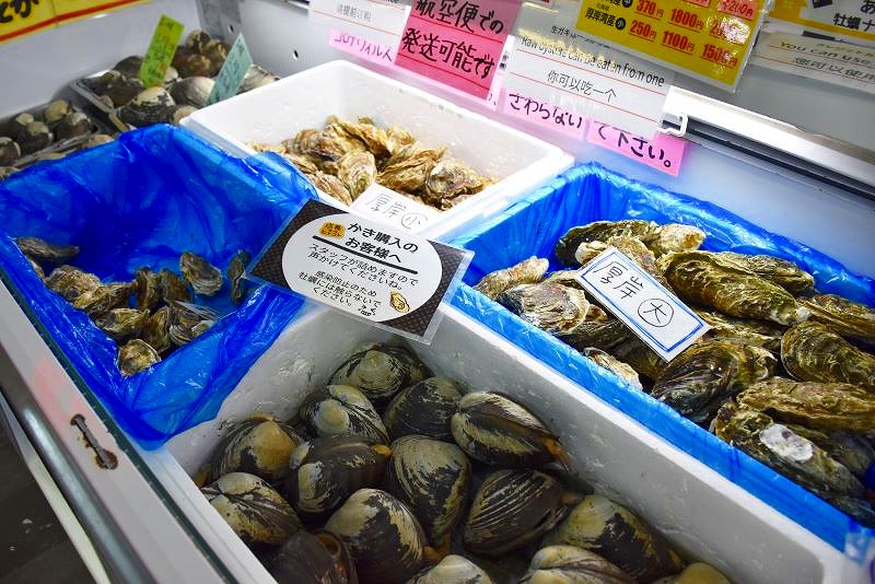 店内には椅子席の他に立ち席もあって、カキ1個から気軽に食べることができます。「市場のいろいろな店に立ち寄って、おいしいものを少しずつ食べ歩きしてください」(宮澤店長)とのこと。朝9時からやっていますよ。
