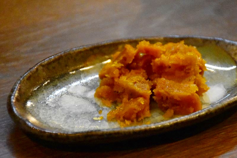 1皿目は、ニンジンとウニ、イカスミを練り込んだチップの上にヤリイカがのったものです。口に含んだ瞬間からひと味もふた味も違う! 最初からガツンとやられました。