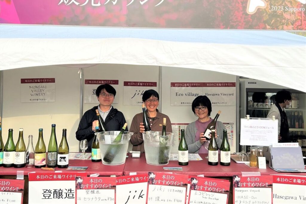 それではさっそく、ワインを選びましょう。会場の6丁目に近い北側には、ワイナリー販売カウンターが設けられ、日替わりで各地のワイナリーやヴィンヤードの生産者が来場し、直接お話を聞きながらワイン選びができます。この日は、登醸造やじきの畑、長谷川ヴィンヤードなど後志管内余市町の生産者の方々が自慢のワインを手に並んでいました。