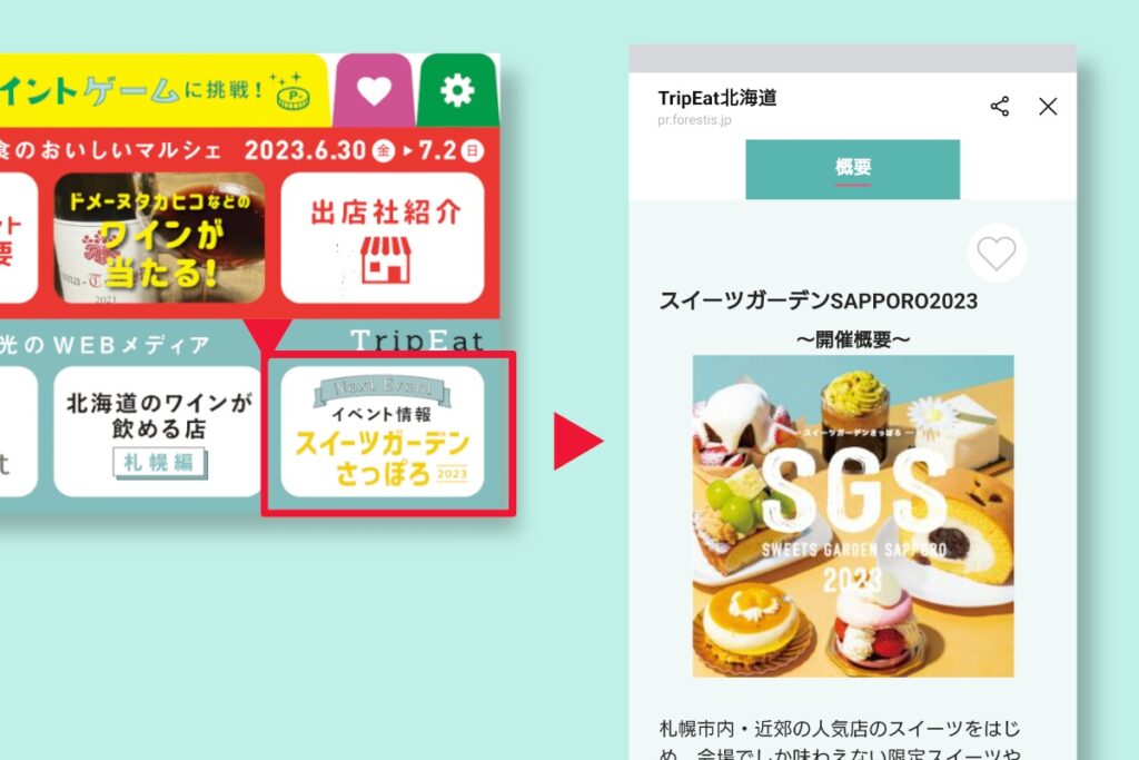 その右隣の「イベント情報」では、今年も8月に開催予定の「スイーツガーデンSAPPORO 2023」の開催概要をお知らせ。札幌の盛夏に開かれる「スイーツグルメイベント」、開催が楽しみです。