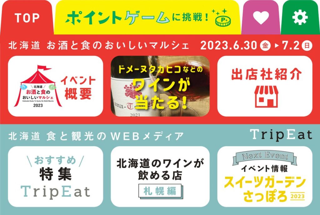 北海道の食や観光にまつわる話題をお伝えしているWEBサイト「TripEat北海道」が開設したLINE公式アカウント。「友だち登録」していただくことで、楽しいイベントやキャンペーン情報を受け取れるほか、「ポイントゲーム」などのコンテンツも楽しめます。開設を記念して行った第1弾キャンペーン「北海道産ワインプレゼント」にも多数の応募をいただきましたが、続く「第2弾」が近くスタートします。今度は、6月30日(金)~7月2日(日)の3日間、札幌大通公園8丁目を会場に開催される「北海道 お酒と食のおいしいマルシェ2023」に来場していただいた方が対象。既に「友だち登録」済みの方はもちろん、会場での「友だち登録」で、なかなか手に入らないとされる貴重な道産ワインを抽選で10 名にプレゼントします。