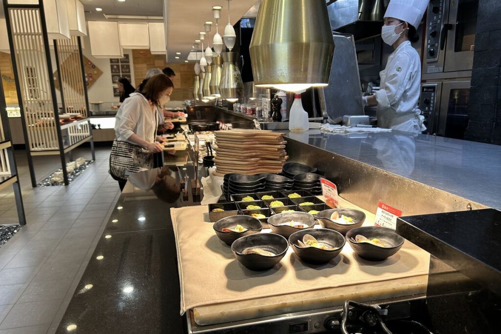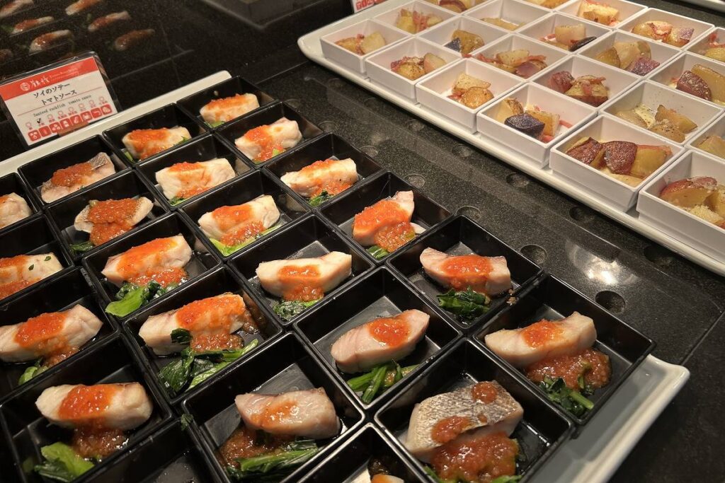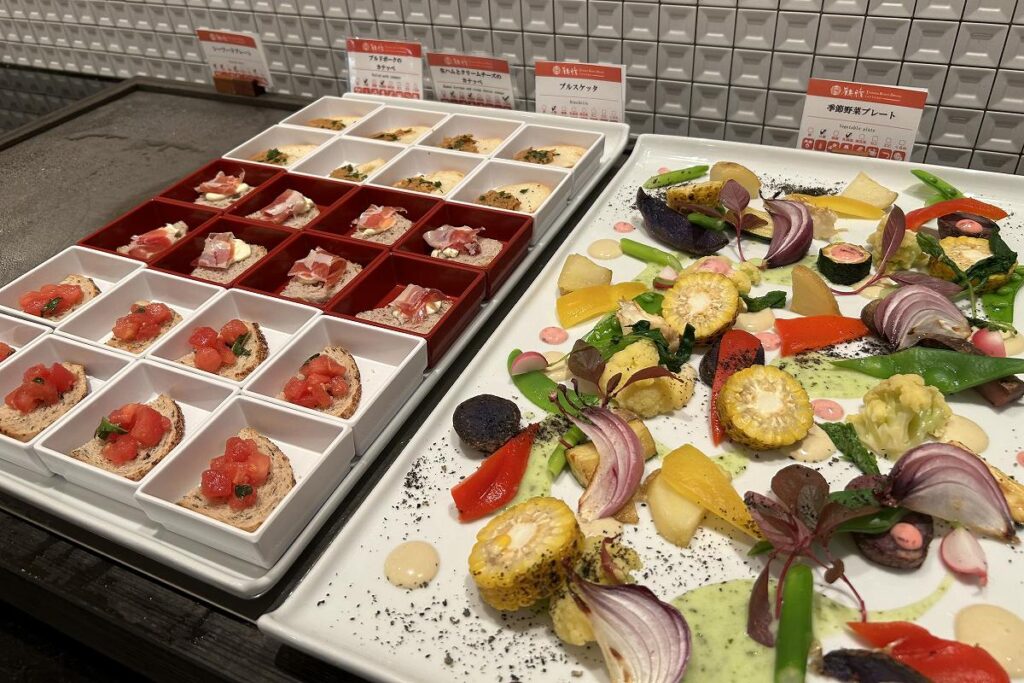 鶴雅はそれぞれのお酒に合う料理やデザートなどを用意。パプリカやレッドオニオン、トウモロコシなど新鮮な野菜をグリルした「季節野菜プレート」や「エビと押し麦のバジルリゾット」、トマトソースを添えたソイのソテー、三升漬けのディップで味わうホエ豚のソテー、「とかちマッシュとヤングコーンのマリネ」「釧路名物ザンたれ」など、道産食材や道内のご当地グルメをアレンジした料理を提供しました。色も鮮やかで、ついトレイに取る手も迷います。サラダがおしゃれな小型の瓶のジャーに入っていたり、料理が一口サイズで豆皿や小さなカップに盛り付けられていたりと、大皿から取る形式ではなく、衛生面にもじゅうぶん配慮されています。