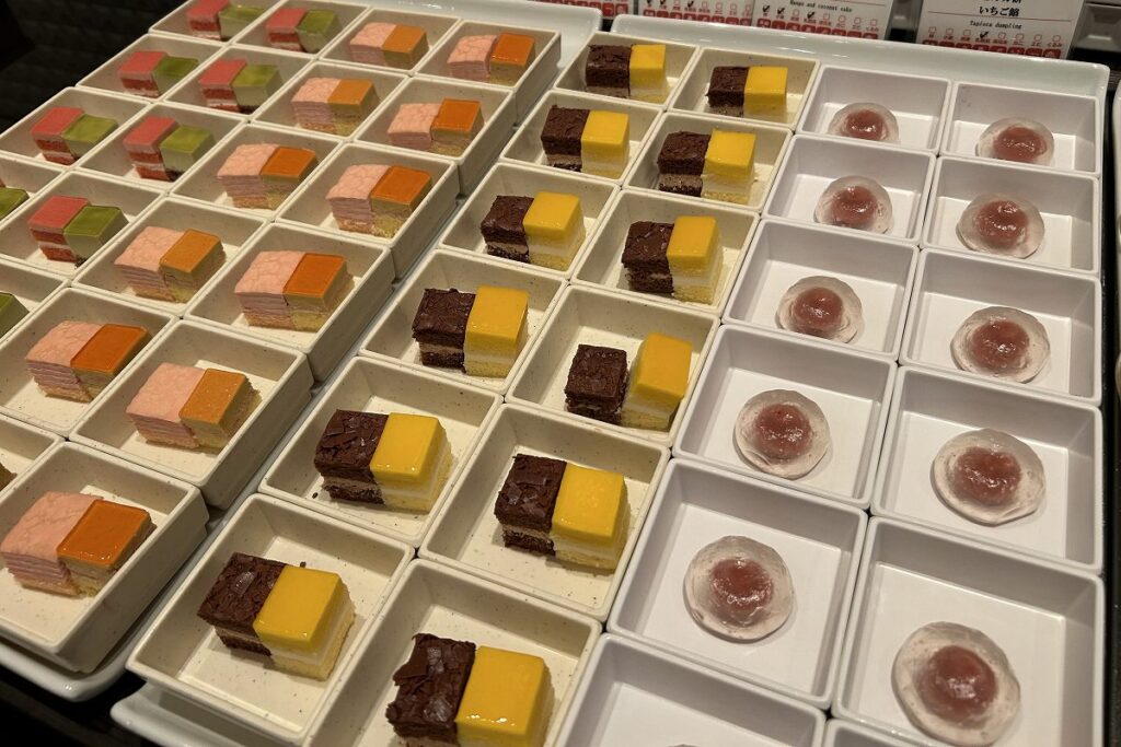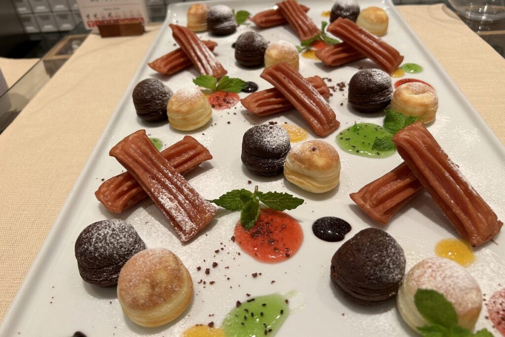 デザートも朱色が美しい「タピオカ餅いちご庵」や鮮やかな緑色の「ピスタチオのムース」、対照的にくっきりとしたルビー色の「ラズベリーブラン」、フルーツや和のわらびもちなどが並びます。和洋幅広く、カラフルな心楽しくなる一皿が、これも豆皿や小さなカップで提供されました。