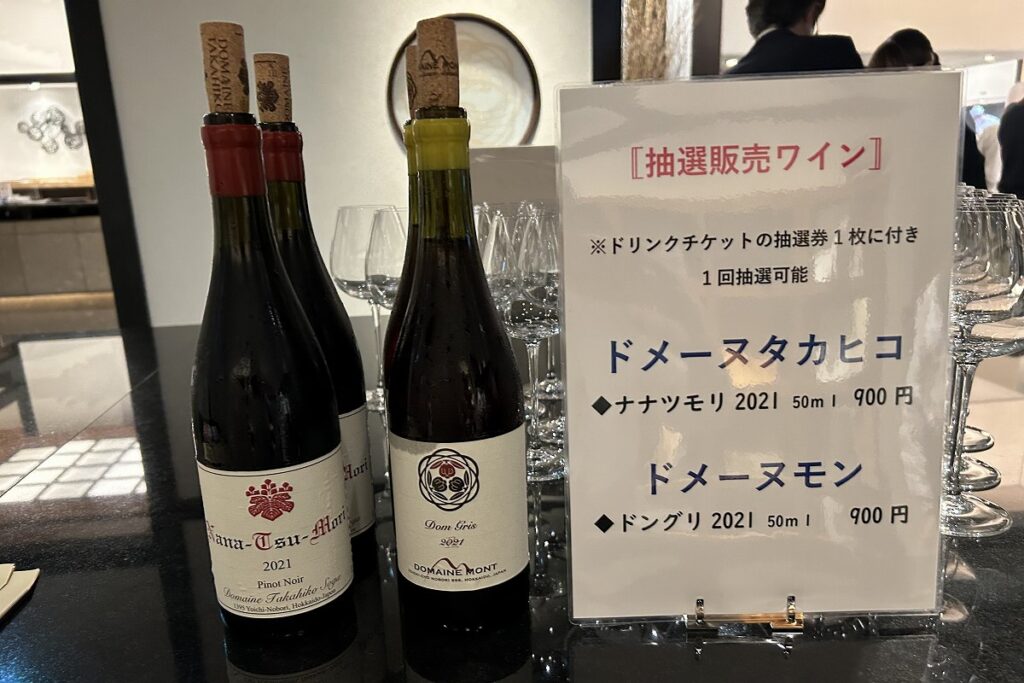 最も注目を集めたのは、「ドメーヌ・タカヒコ ナナツモリ 2021」と「ドメーヌ・モン ドングリ 2021」の抽選販売です。各30杯限定で、50ミリリットル900円で、抽選に当たった人に販売されました。タブレットで福引きの抽選器を回し、「当たり」が出ると、「うれしい」「やったー」と歓声が上がりました。50ミリリットルと少量ながら、当選した人は「大切に味わいます」と席に持ち帰りました。