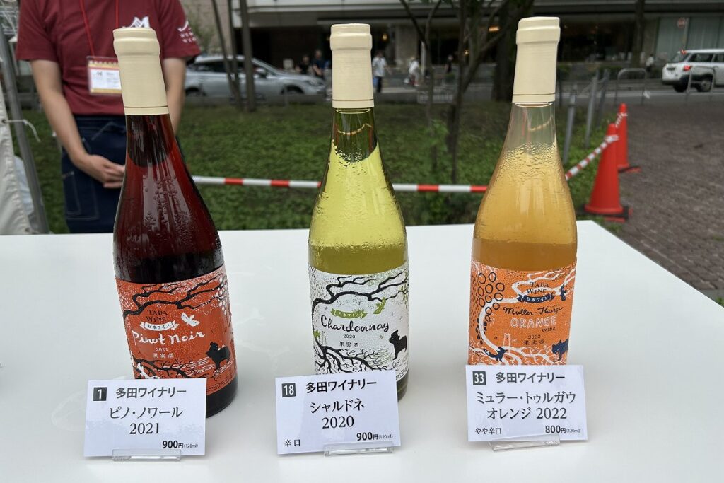 この日は、多田農園(上富良野町)の多田繁夫代表と醸造責任者の菅井伸一さんが会場入り。多田農園は赤の「ピノ・ノワール 2021」(900円)と白の「シャルドネ 2020」(同)、オレンジの「ミュラー・トゥルガウ オレンジ 2022」(800円)を出品しています。菅井さんは「白は果実感があり、アカシアや白い花の香りがするすっきりとした飲み口。赤は飲みやすく、ミネラルを感じられるエレガントな味。オレンジは皮から出る渋みやタンニンで複雑さを感じられます」と説明してくれました。多田さんは「どれも、食事にワインが寄り添う感じで、肉にも魚介類にも合わせやすいです」とすすめます。