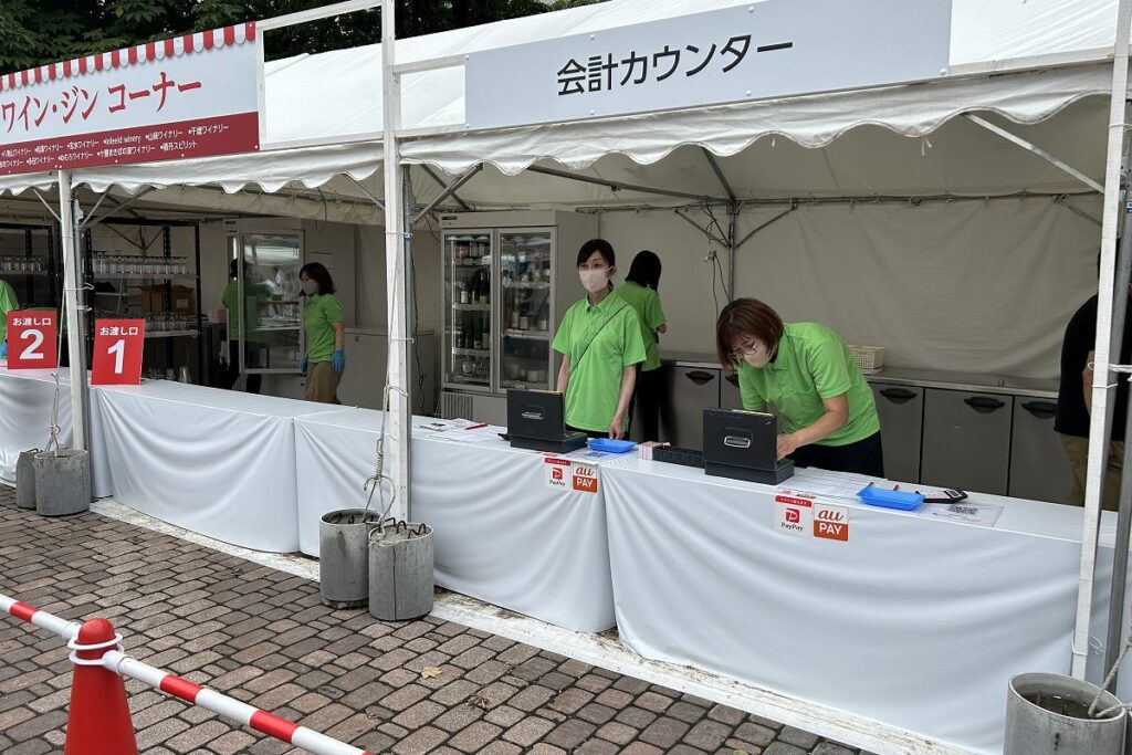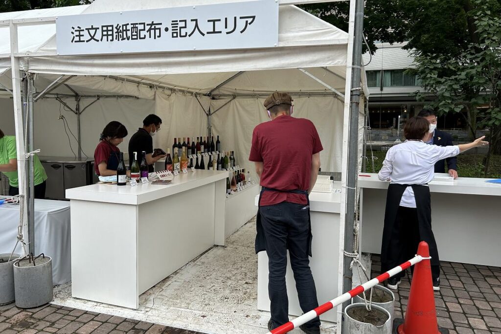 会場南側の西側にはワインのカウンターが、東側には日本酒のカウンターがもうけられています。いずれも、注文用紙配布・記入エリアにある用紙を入手し、購入したいワインやお酒にチェックを付け、横の会計カウンターに提出。支払いをしてから、その横のカウンターで商品を受け取ります。