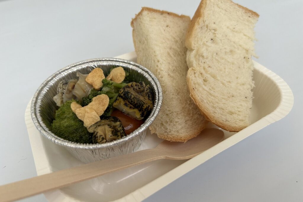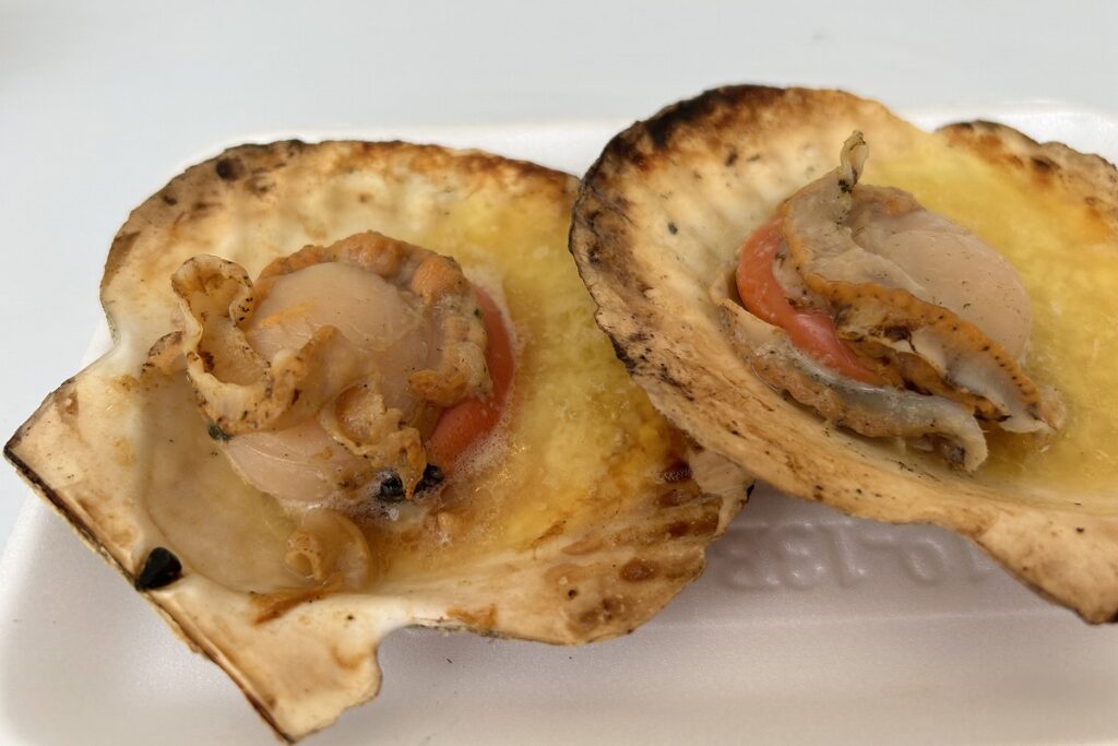 ひがし北海道つぶ貝本舗・つぶ貝と旅するクシロバコ(釧路)は、新商品のツブのアヒージョ(千円)が人気。ツブのほか、ブロッコリーやトマトが入り、パンが付きます。ガーリックチップの香りと、ツブの食感が絶妙で、ワインにもビールにも合います。殻ごと炭火で焼き上げたしょうゆ味の「つぶ焼き」(4個千円)や串焼き(4本千円)の香りには、日本酒を手にした人たちがふらふらと引き寄せられていました。