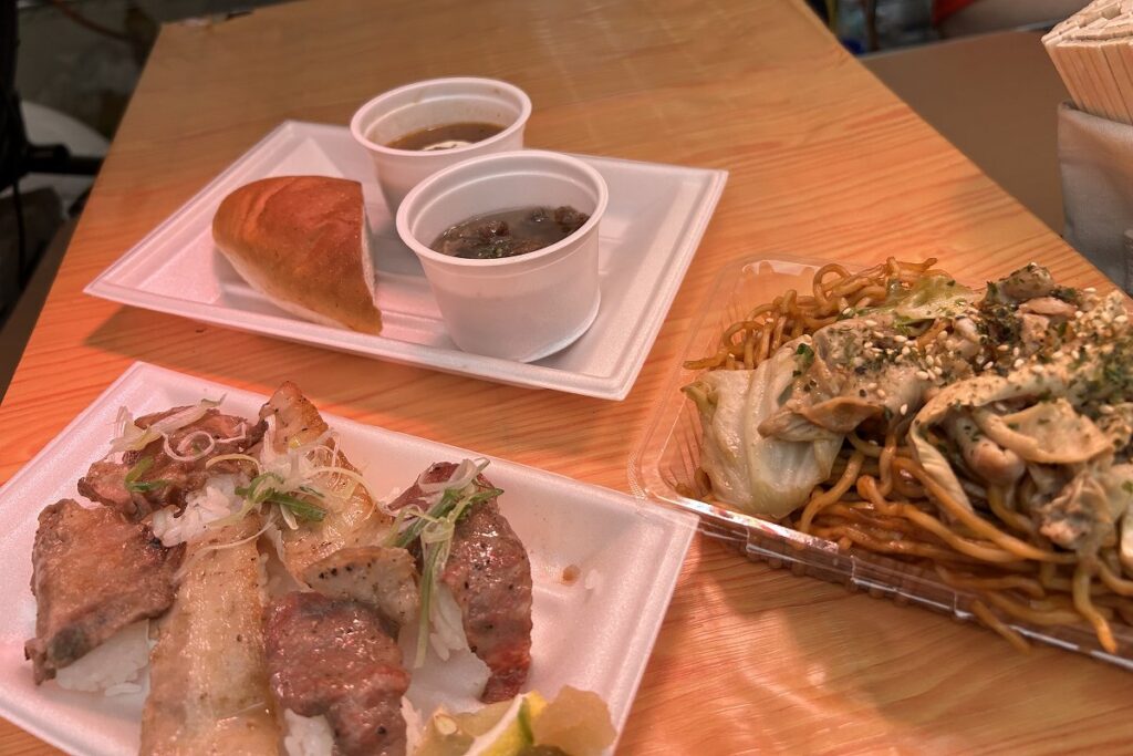 牛たん・ホルモンと炙り肉寿司 鈴の屋(札幌)は、昨年も人気だった肉寿司を買い求める人が多くいました。牛たん元とラベンダーポーク、白老和牛の炙りがのった握りで、6貫セットで1400円。具だくさんの「ミックスホルモン焼きそば」(800円)や「牛タンのアヒージョ」(600円)も人気だそうです。
