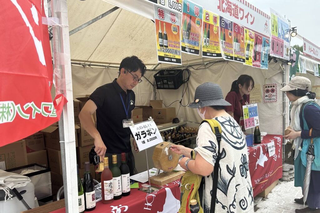 北海道ワイン(小樽)は、商店街の福引きで使うような「ガラポン抽選」でボトルワインを販売しています。ガラポンを回して出た玉の色によって、4等から特賞まで外れなしで当たる仕組みで、1回2千円で必ず2500円以上のワインと引き換えることができます。特賞は1本1万2千円のスパークリングワインの白とロゼのセットで、これが出ればとってもお得。来場者が挑戦するたびに「大当たりー!」と大きな鐘の音が響いていました。グラス提供もしており、白、赤それぞれ3種類(1杯80ミリリットル入り)の飲み比べセットは千円です。