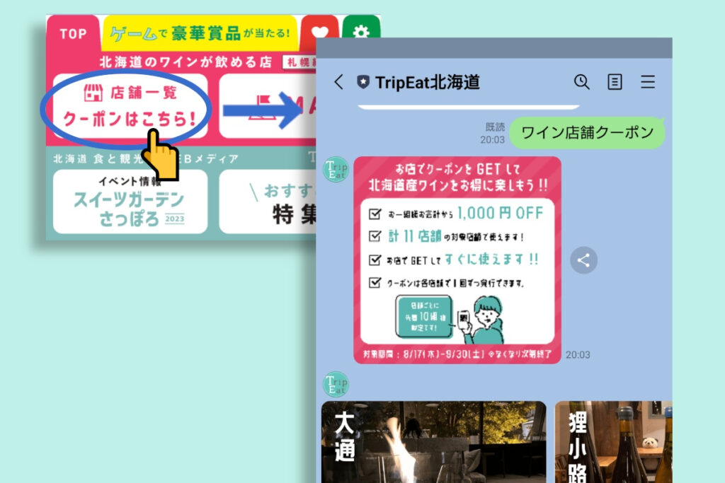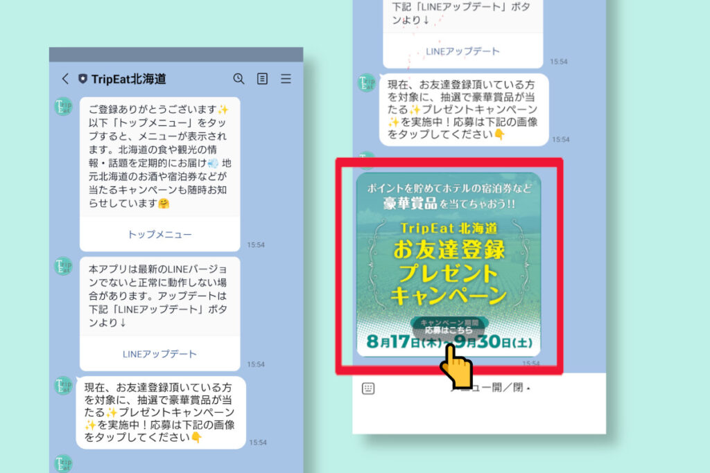 「TripEat北海道」が6月から始めたLINE公式アカウントを、より多くの方に活用してもらうため、友だち登録していただいているユーザーのみなさん全員を対象に8月17日(木)から、抽選で豪華賞品が当たるキャンペーンや、「クーポン」サービスをスタートさせます。登録済みの方はもちろん、これから登録する方もプレゼント応募やクーポンを利用できます。まずは「友だち登録」を―。