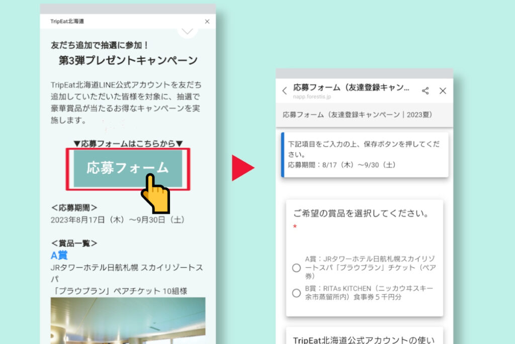 まずご紹介するのは、「TripEat北海道」LINE公式アカウント開設記念プレゼントキャンペーンの第3弾。LINEで「友だち登録」していただいたユーザー全員が対象です。賞品は2種類になります。