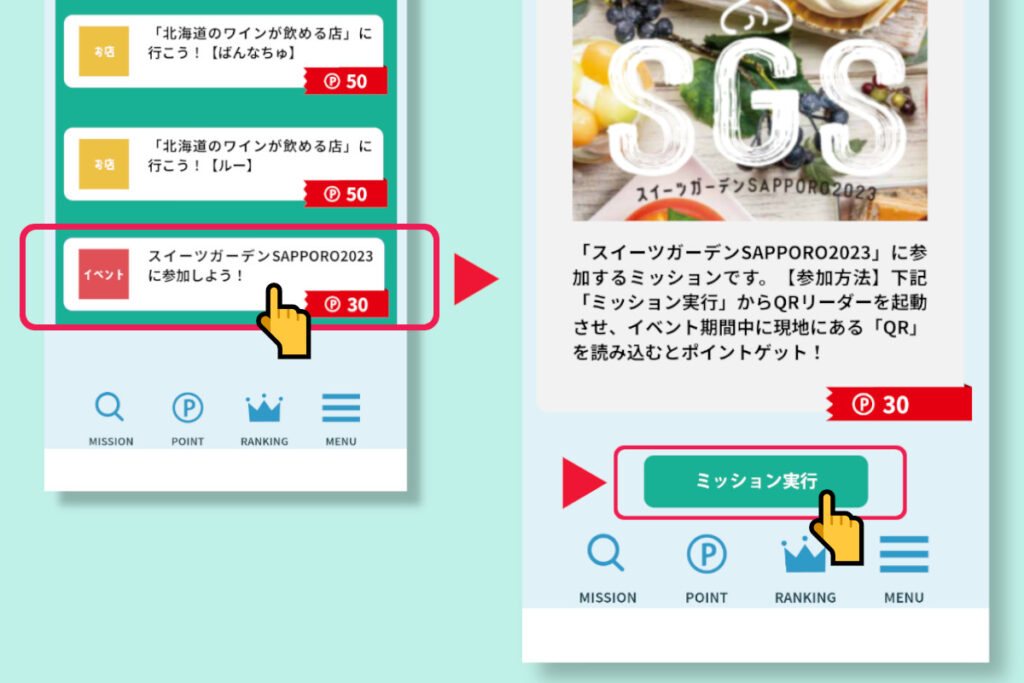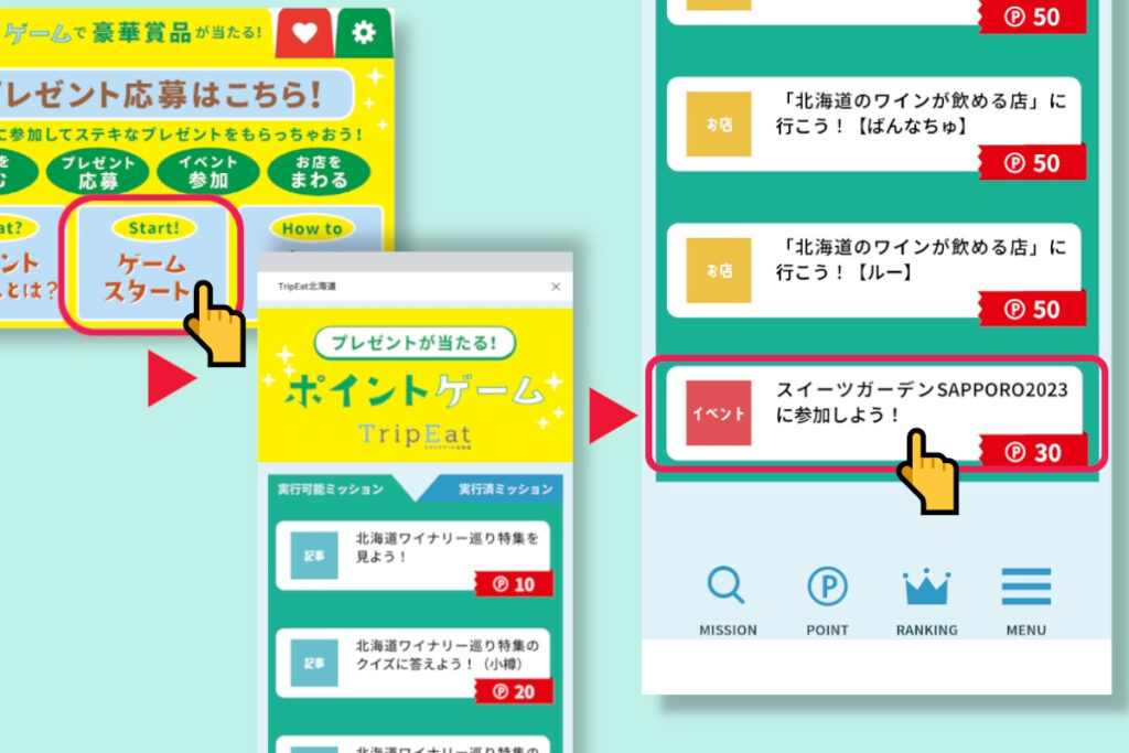 その1つが、8月17日(木)に開幕した「スイーツガーデンSAPPORO 2023」への参加ミッション。札幌市内や近郊のお店自慢のスイーツが集結する、夏恒例の屋外スイーツイベントですが、現地会場のインフォーメーションブースに置いてあるQRコードを読み取ることでポイントが獲得できます。「ゲームスタート!」から「スイーツガーデンSAPPORO 2023に参加しよう!」をタップしてミッションをクリアしましょう。