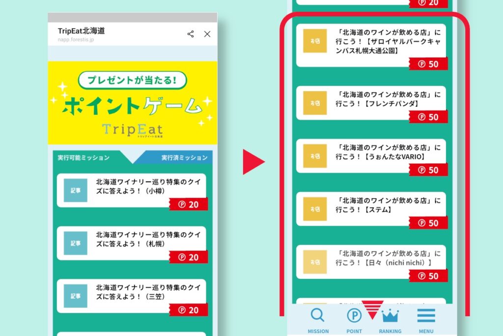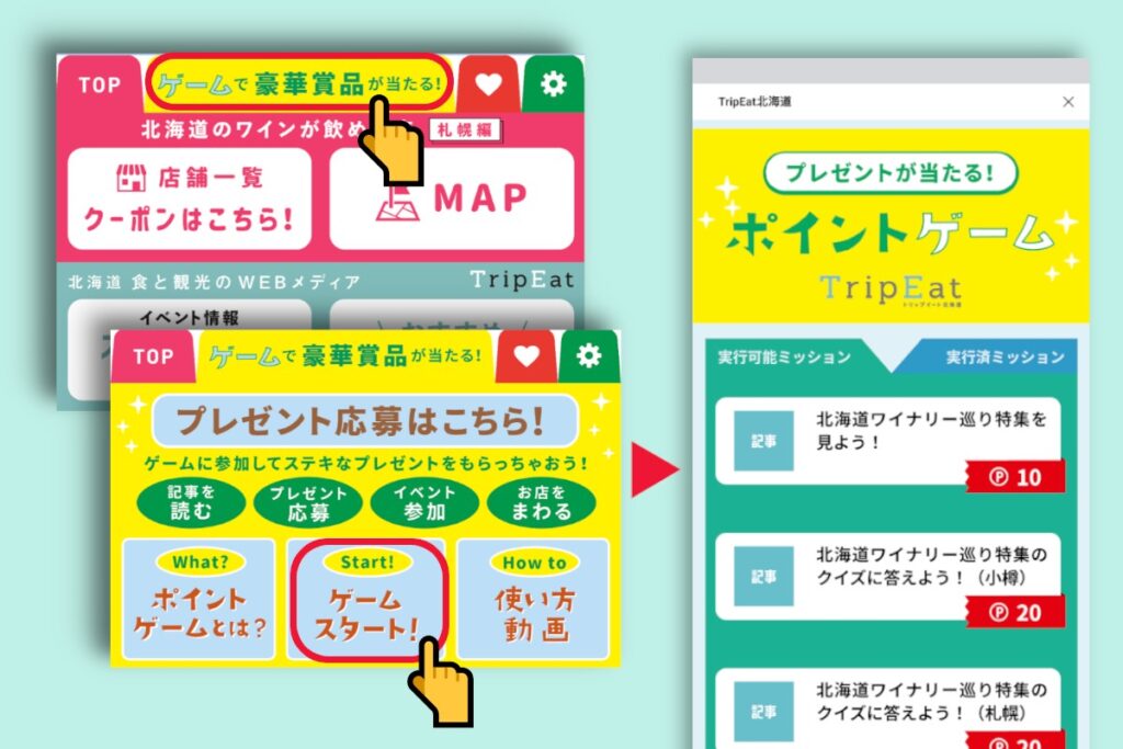 TripEat北海道の記事を読む「北海道ワイナリー巡り特集を見よう!」や、特集記事の中から出題されている「クイズに答えよう!」のミッションはすぐに挑戦できますので、気軽にチャレンジしてみてください。