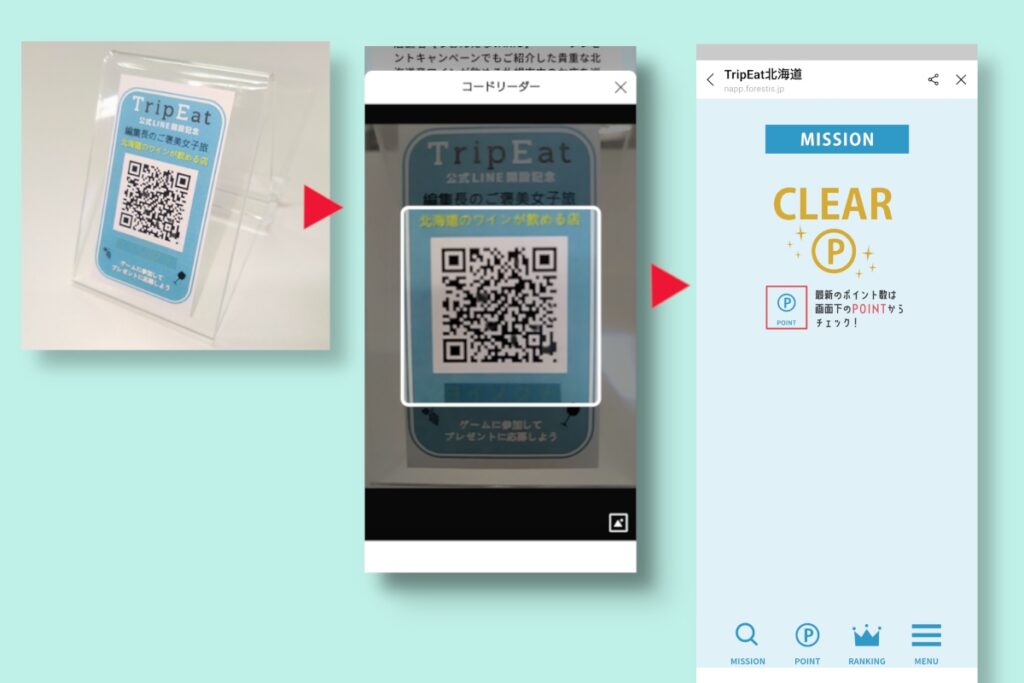 もう1つの参加型ゲームが「道産ワインの飲める店へ行こう!」です。こちらも「ゲームスタート!」で表示される「実行可能ミッション」に、対象としている11店舗分のミッションを用意しています。訪れたお店の「ミッション実行」をタップすると表示されるコードリーダーで、お店に置いてある「QRコード」を読み取ると「MISSION CLEAR」が表示され、ポイント獲得です。こちらは9月30日(土)までが実施期間。終了まではまだしばらくあります。お店巡りを楽しみながらポイントを貯めてみてくださいね。