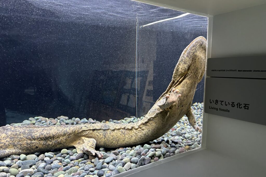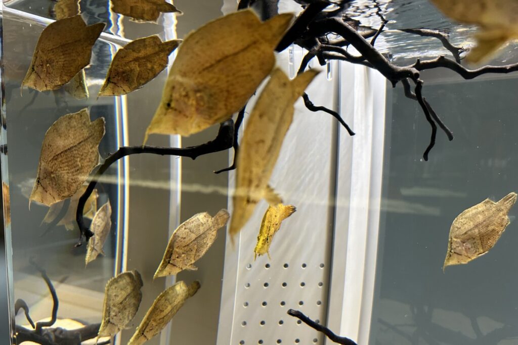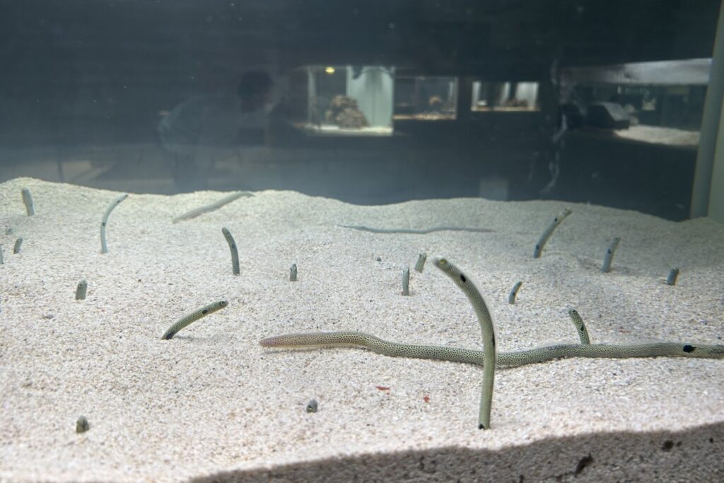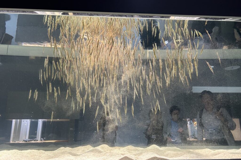「ライブラリーアクアリウム」では、体の見た目や特徴から「ぺったんこ」「にょろ」「もさもさ」「いろいろ」「いきている化石」の5つのテーマごとに、小さなものでは45センチ、大きなものでは7メートルの水槽43個が並んでいます。最も大きい幅7メートルの水槽には、「ぺったんこ」のヘコアユが入っていました。体長15センチほどの細い体で、頭を下に向けて縦に泳ぐ不思議な魚です。水槽全体に集団で縦縞模様をつくって泳いでいますが、日に何度かのえさの時間に水槽の上部からプランクトンを投入すると、磁石で引き寄せられたように、集まってきます。