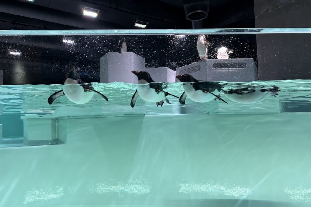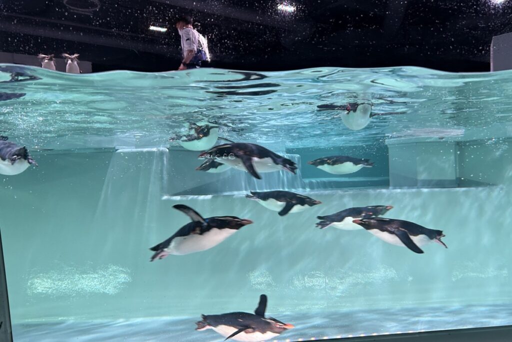 水槽の横から、泳ぐペンギンたちを観察することもできます。陸上ではピョンピョンと跳ねていたキタイワトビペンギンたちは、水中では羽を広げて素早く泳ぎ、まるで空を飛んでいるかのようです。やっぱり鳥の仲間だと実感します。ぷかぷか浮かびながら水槽ごしに見ている人間のところに寄ってきて、まるであいさつをしているようなペンギンたちもいました。