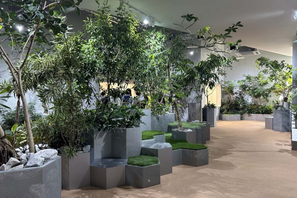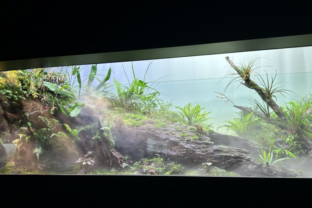 「光と睡蓮の庭」は池の水面に浮く睡蓮の葉を、池の底にいる視点で眺めることができます。「悠久の森」は水が入っておらず、熱帯雨林の植物を植栽し、霧を発生させたり、雨を降らせたりして、自然の様子を再現しています。このコーナーには、魚や水草の名前や説明は書いていません。幻想的な音楽と暗めのライティングで水槽が暗闇に浮かび上がるように見えます。座ることのできる場所もあり、アオアオの担当者は「頭で考えるより、環境の美しさや自然がどうつくられているかを感じてほしい」とします。アオアオの館内では3カ所でナチュラルアロマを放出しているそうです。水槽をぼんやり眺めながら、自然の香りに包まれ、リラックスできそうです。