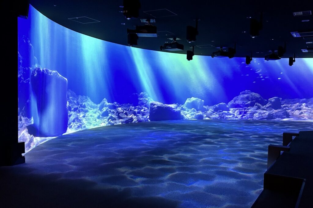 空間全体が青いライトで彩られた「ブルールーム」もあります。幅約20メートルの巨大スクリーンに、青く美しい海の中の世界を光と音で再現し、知床の海に生きるシャチやマッコウクジラなどが映し出されます。人の動きを察知して、動物たちが近づいてくることもあります。室内には座るのにちょうどいい台も設置され、長い時間ぼんやりと海の中の世界を堪能するのも良さそうです。