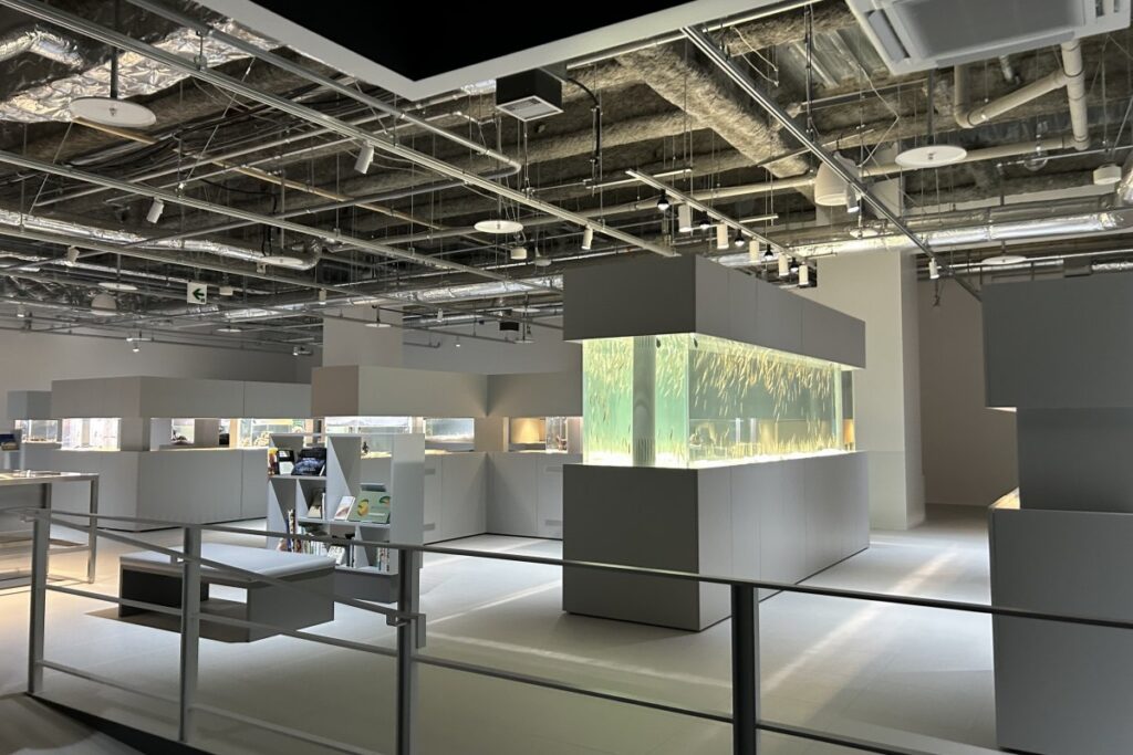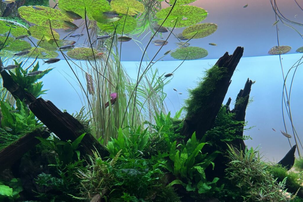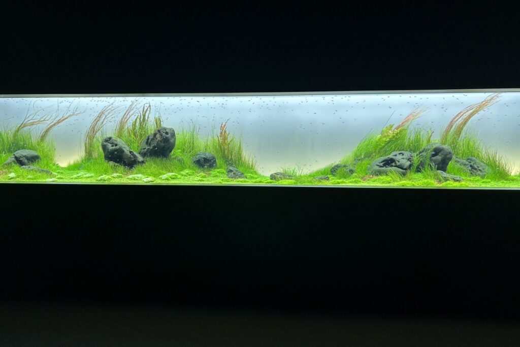 エントランスは4階。まず、5階に上がってみます。暗闇の中、大型水槽4基が間隔を空けて展示されています。石や流木、水草などで生態系を再現した「ネイチャーアクアリウム」です。最も大きい幅7メートルの水槽は「風薫る石景」と名付けられ、小さな青い魚が泳いでいます。この小魚は水槽に入れられた水草が光合成をしてつくる酸素で生きており、小魚のふんは水草の養分になり、水槽の中で生態系が完結されています。水草がつくった酸素が気泡になって静かに水面に上っていくのも見えます。