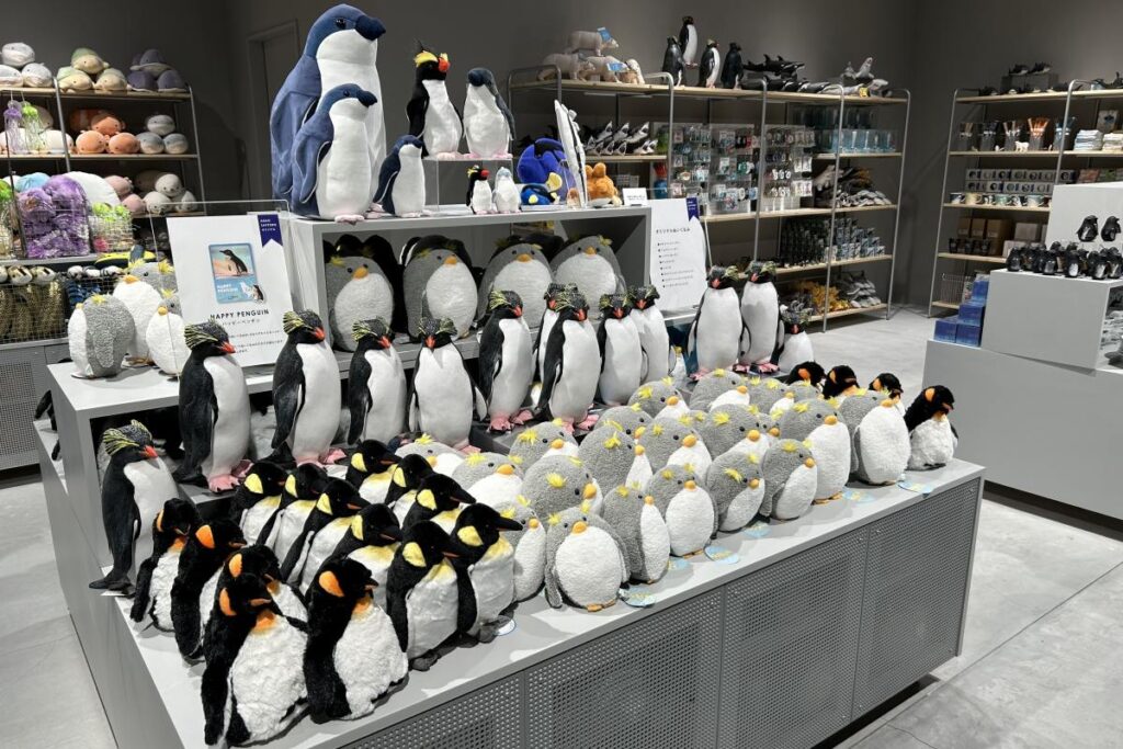 売店には、オリジナルのグッズもたくさんあります。キタイワトビペンギンやフェアリーペンギンのぬいぐるみのほか、イワトビペンギンの陸場をつくる六角形のブロックを模したクッキーなどもあります。意外にかわいらしいのが、「ぺったんこ」のコーナーにいた細長く平べったいヘコアユのポーチ。人気が出るかもしれません。このほか、札幌在住のアーティスト3人とコラボしたTシャツやトートバッグ、キーホルダーなど、オープンまでさらに商品が増えそうとのことです。