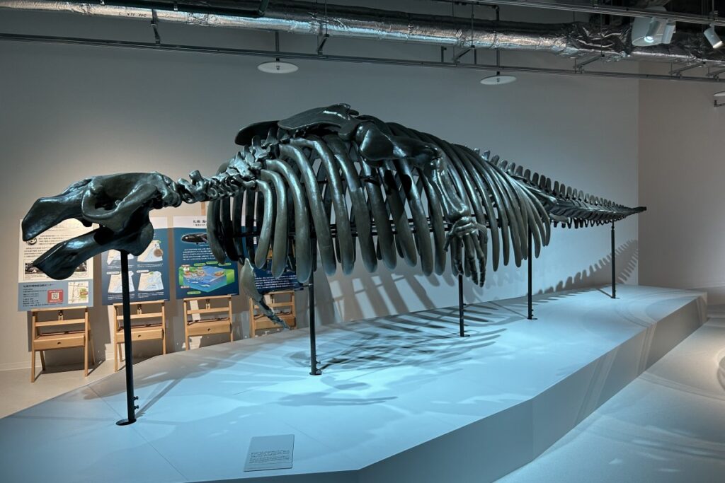 「ライブラリーアクアリウム」の最後には、全長約7メートルのサッポロカイギュウの復元骨格標本が出迎えます。札幌市博物館活動センターと連携し、センター所有の標本を借り受けています。サッポロカイギュウは世界最古の大型海牛で、約820万年前、海だった札幌周辺で暮らしていたとされています。