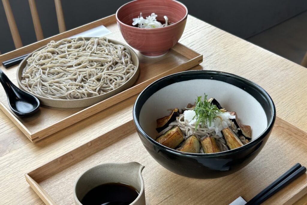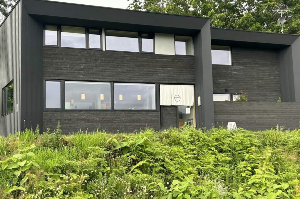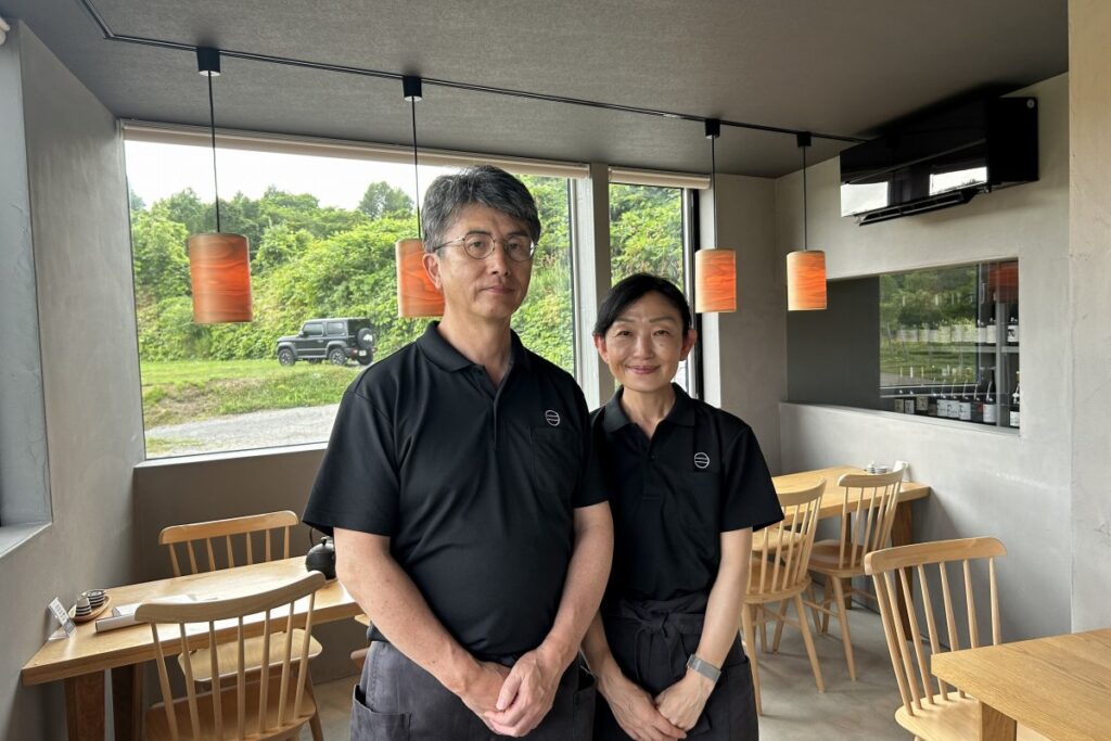 札幌から余市、仁木までは、乗り換え時間にもよりますがJRで1時間から1時間半、高速バスなら直通で1時間40分から1時間50分です。仁木に到着後、まずはお昼ご飯。多くのワイナリーが集まる旭台地区にある蕎麦と日本ワイン「naritaya(なりたや)」に向かいます。店を営む成田真奈美さん、和仁さん夫妻は2020年に東京から移住、21年にこの店をオープンしました。そば打ちを和仁さんが、ホールを真奈美さんが受け持ちます。実はお2人、ワイン好きが高じてヴィンヤードを運営しており、この店を上った丘の約30アールでブドウ約千本を育てています。
