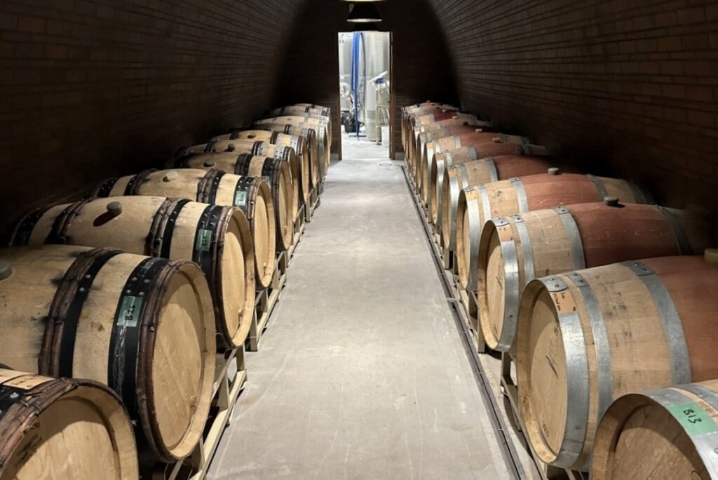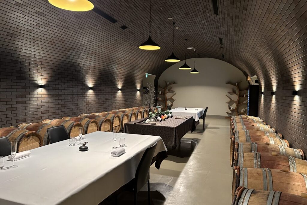 地下のワイナリーもちょっとのぞかせてもらいました。2千リットルの醸造タンクが並ぶ醸造室や自動で瓶詰めできる機械、発酵室、ワインを熟成させている樽庫などがあります。地下には宿泊客のみが食事できる特別な部屋もあり、天井がワイン樽のようにカーブし、ヨーロッパの古い修道院のような厳かな雰囲気を醸し出しています。大きなセラーもありました。ワイナリーの見学は事前予約が必要です。
