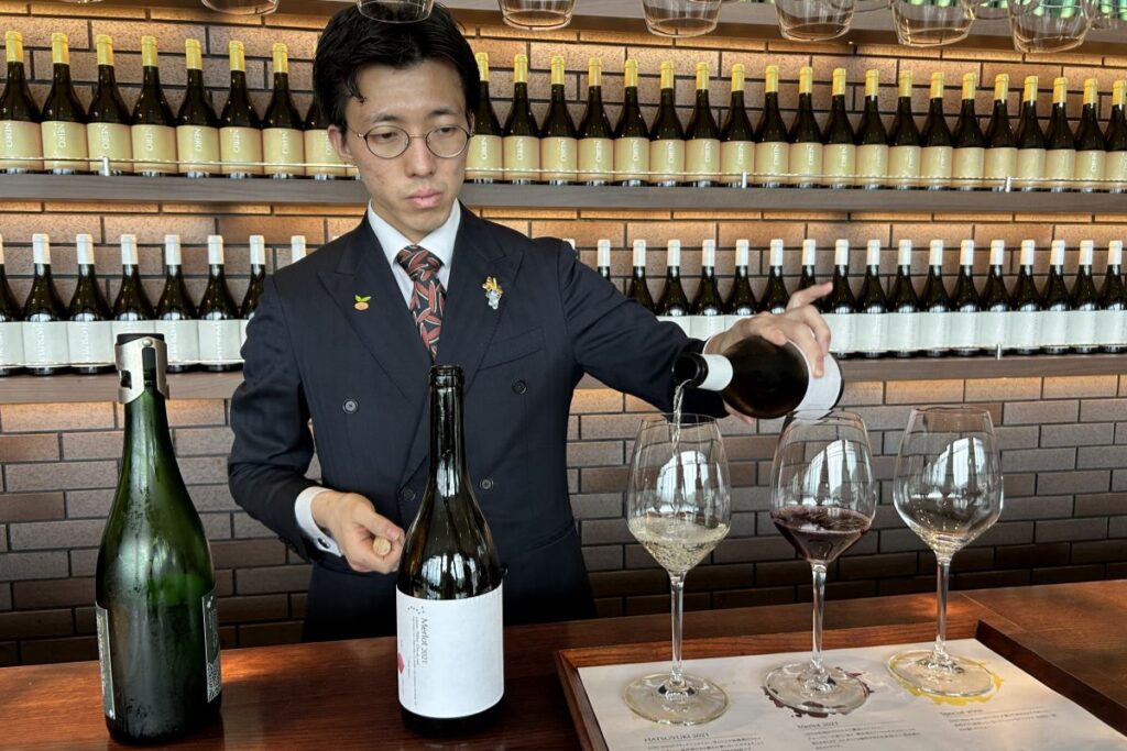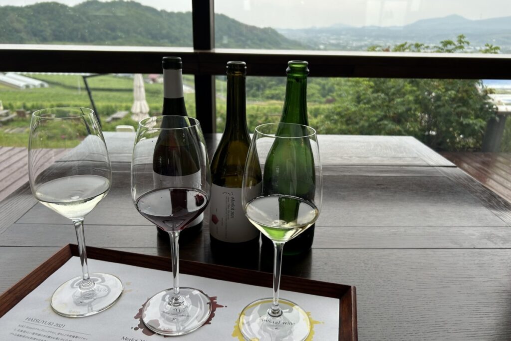 1階に戻り、テイスティングします。単体のグラスワインもありますが、テイスティングセットも2種類用意されています。HATSUYUKIとメルロー、ソムリエがその日選んでくれるスペシャルの3種のAセットが2750円、HATSUYUKIとNEIRO、貴腐ワイン「はつゆきLATE HARVEST」の3種のBセットが2200円です。どちらのセットも3種各90ミリリットルずつ。Aセットを選ぶと、スペシャルは2020年のスパークリング、メルローとHATSUYUKIは2021年でした。
