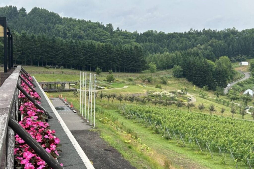 この日はあいにくの小雨模様でしたが、この丘の上からは、晴れていれば、余市岳や頂白山、石狩湾も望むことができるそうです。丘の斜面には3段階の傾斜を付けたナチュラルガーデンが整備されています。ガーデンは、テレビ番組の園芸講座で講師を務めたガーデナーの福森久雄さんが監修し、季節に合わせてさまざまな花が咲き乱れます。傾斜の角度が違うので、ガーデンから見るブドウ畑やワイナリーの風景が変わるそうです。