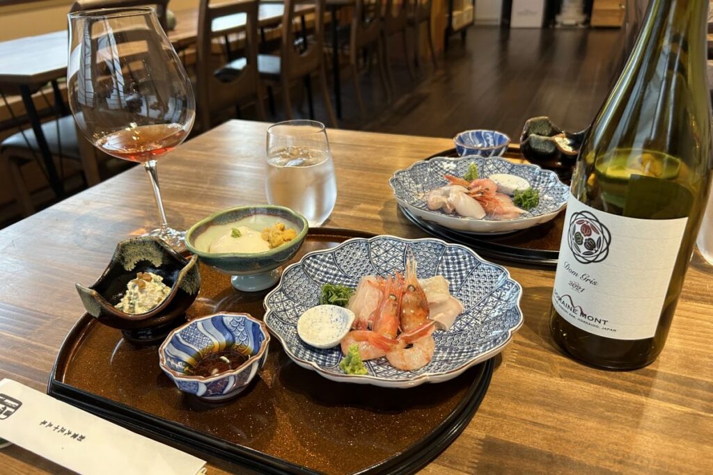 本日の夕食と宿は、余市駅前にある「かくと徳島屋」です。ここでは、入手困難な「ドメーヌ・タカヒコ ナナツモリ」と「ドメーヌ・アツシ・スズキ パストゥグラン」「ドメーヌ・モン ドングリ」の3種類各45ミリずつのテイスティングセットを飲むことができます。料理は京都の高級料亭「本家たん熊本店」で修行をしたご主人の当宮弘晃さんが「Vin de 時候膳」と名付けたコースで提供してくれます。