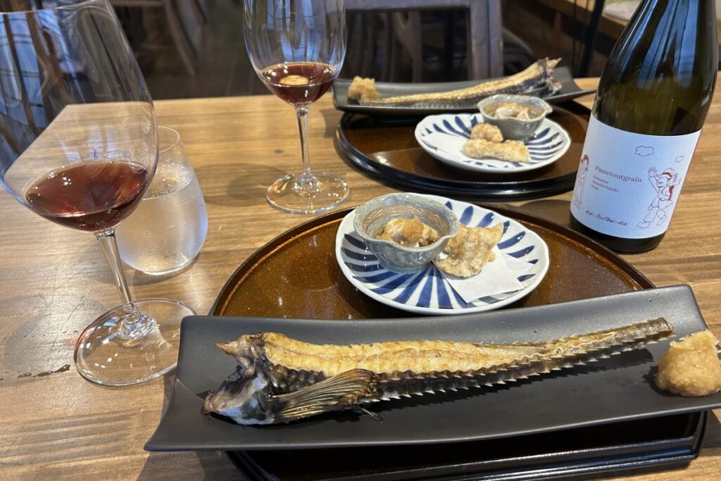 次はパストゥグラン2020がやってきました。ピノ・ノワールとツヴァイゲルトを自然酵母で発酵させており、繊細で優しい味わいです。「河豚の唐揚げ 焼白子 鉄皮 ポン酢」と「八角焼 染めおろし」が運ばれてきます。フグは余市産で、白子と身はマフグ、皮はトラフグです。白子のふんわり感とからあげにした身の弾力、鉄皮のコリコリした食感が楽しく、同じポン酢がかかっているのに、まったく違う料理のように感じます。ワインの力強い味わいは脂ののったハッカクに負けず、でもじゃまをせず、手は身をほぐすのとグラスに伸ばすので大忙しです。