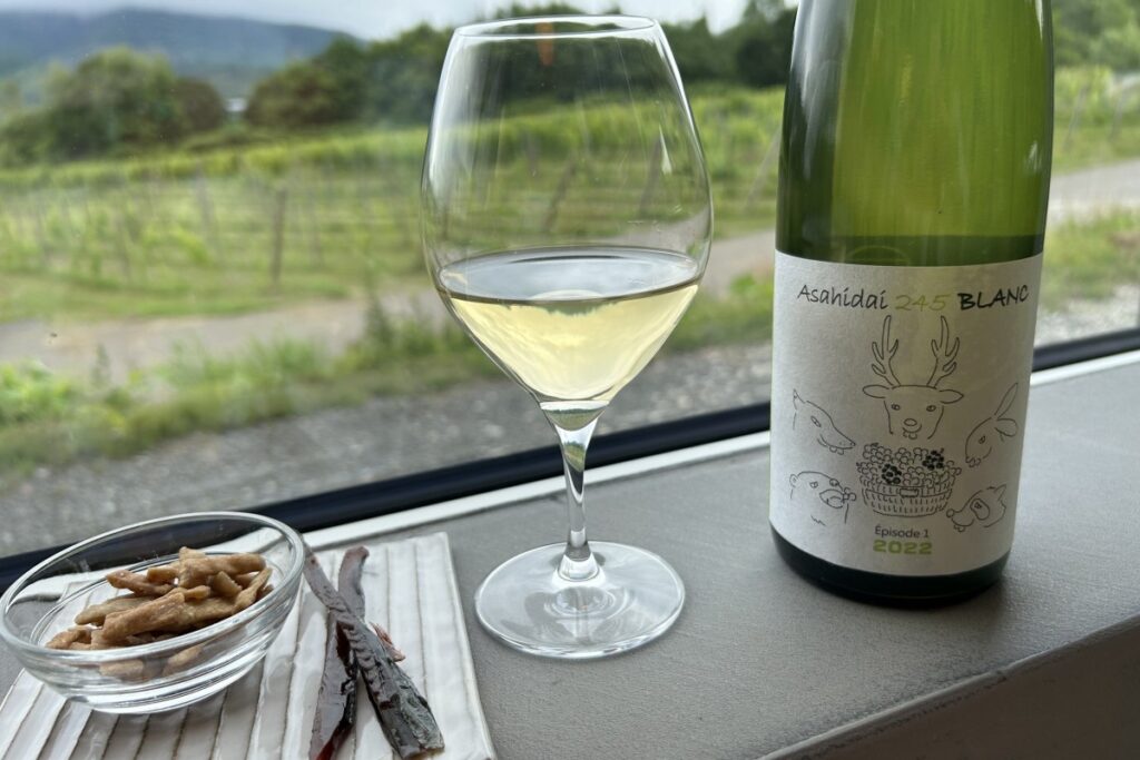 まずはそば前に、成田さんのブドウでつくった「Asahidai245 BLANC 2022」(770円)とお通しプレート(330円)をお願いします。ワインはさっぱりして香りもさわやかで、夏にぴったり。店内には壁2面に大きな窓があり、ブドウ畑を眺めながら味わいます。「実はそこはお隣さんの畑です」と真奈美さん。いいんです、借景でもおいしいワインとブドウ畑の緑で心がのびのびします。お通しは揚げそばと余市産のニシンジャーキーです。