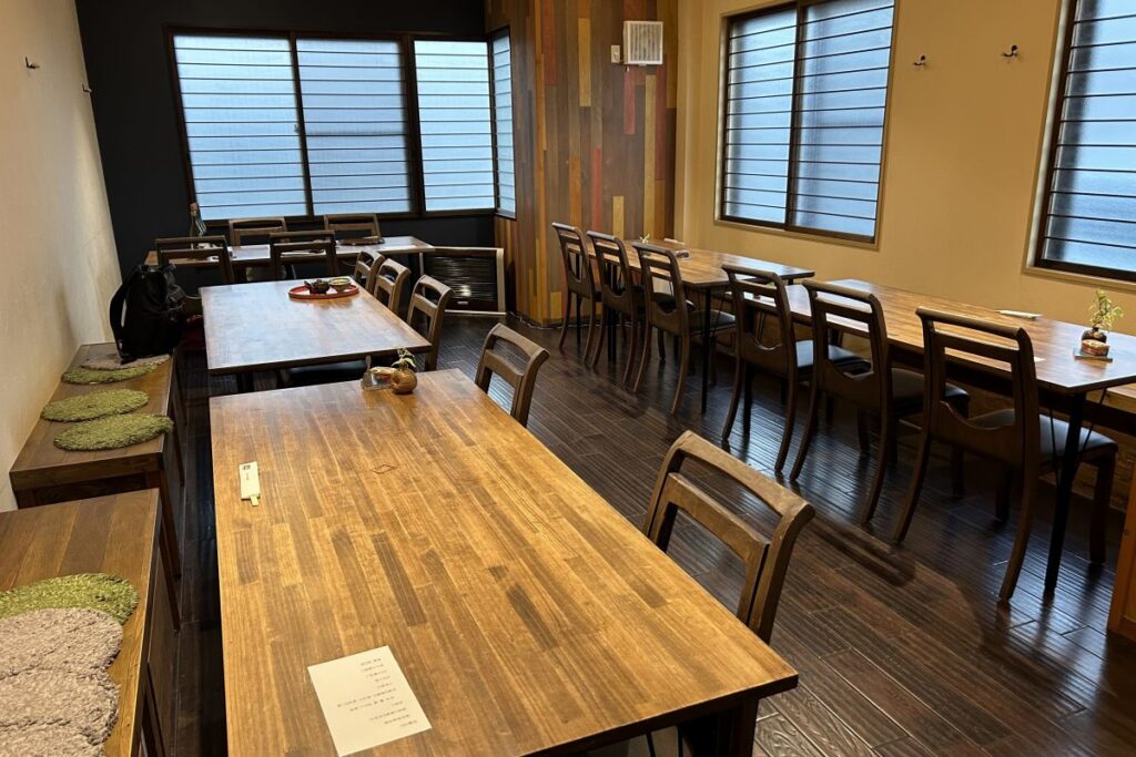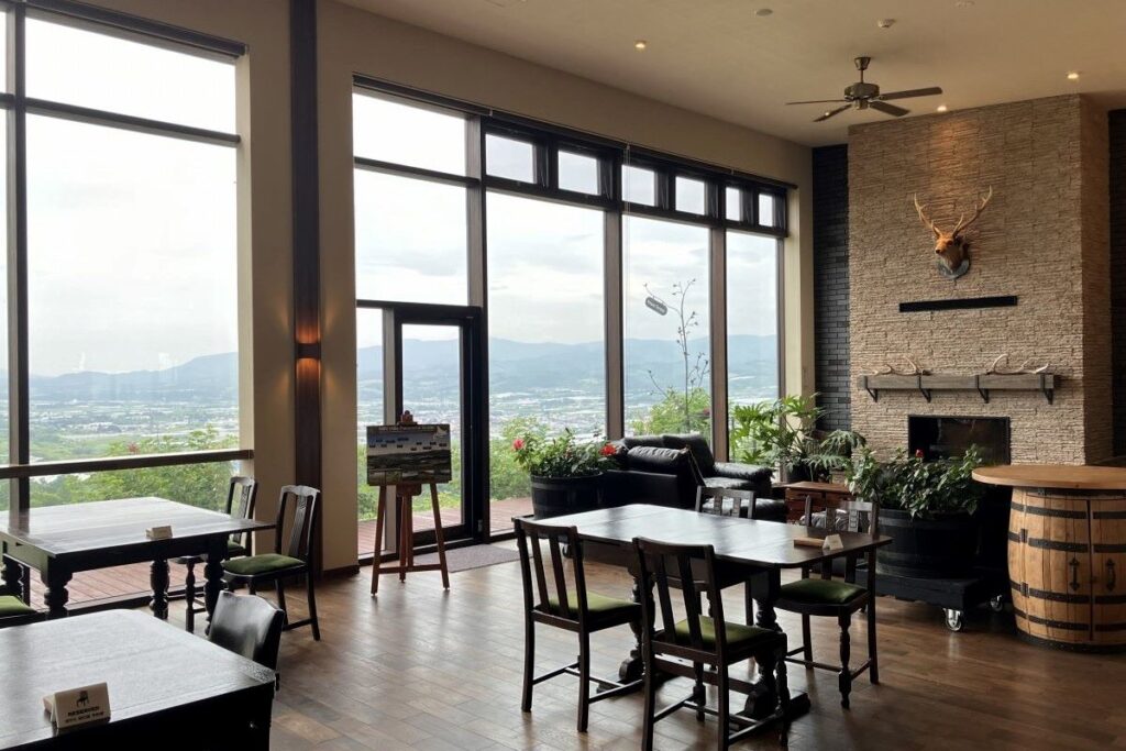建物の1階はレストランとショップがあります。丘を見下ろす方向に大きな窓があり、室内に光が差し込みます。レストランには10人以上が着席できる長いテーブルといすのほか、アンティーク調のテーブルやいすが配置され、奥にはソファ席もあります。壁いっぱいの窓からは、ブドウ畑や仁木、余市の町並みも望むことができます。
