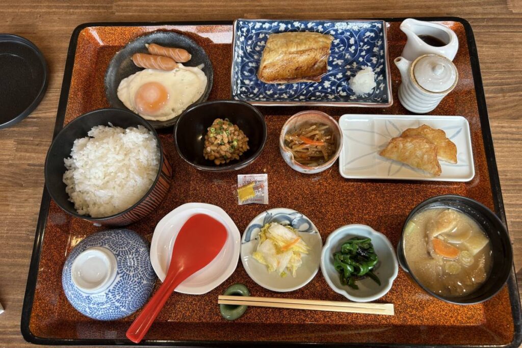 翌朝、前日と同じ部屋でさわやかに朝ご飯です。「日本の正しい朝ご飯」と題名を付けたいくらいの正統派の和食です。ピカピカな白いご飯と豚汁、ぱりっと焼かれたサバ、ほんのり温かくタマネギの甘みがおいしい天ぷらかまぼこ、ピーマンとのりの和え物などがずらりと並びます。さあ、2日目も元気に楽しみます。