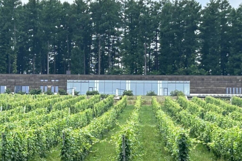 せっかくワイナリーがたくさんある仁木に来たので、1軒寄ってみましょう。ブドウ畑の向こうの丘の上に、こんもりとした森を背負ったワイナリーの建物が見えます。naritaya近くの「NIKI Hills Winery(ニキ・ヒルズワイナリー)」です。2015年に余市町の契約農家から仕入れたブドウで初醸造。耕作放棄地だった土地を改良し、16年にブドウの苗を植栽、2019年から自社ブドウでワインをつくっています。
