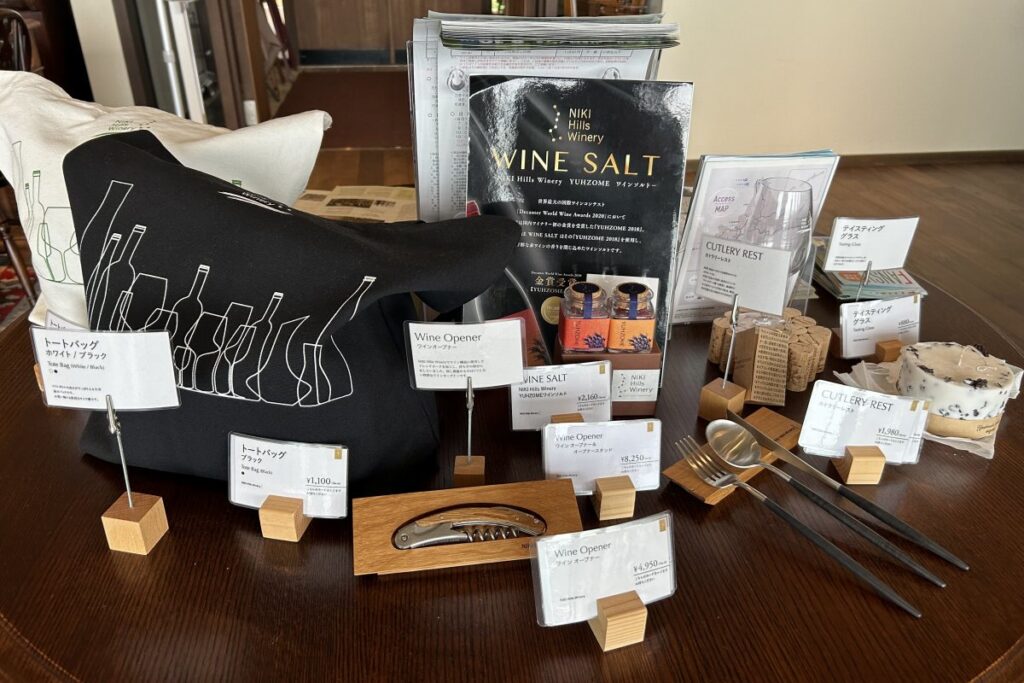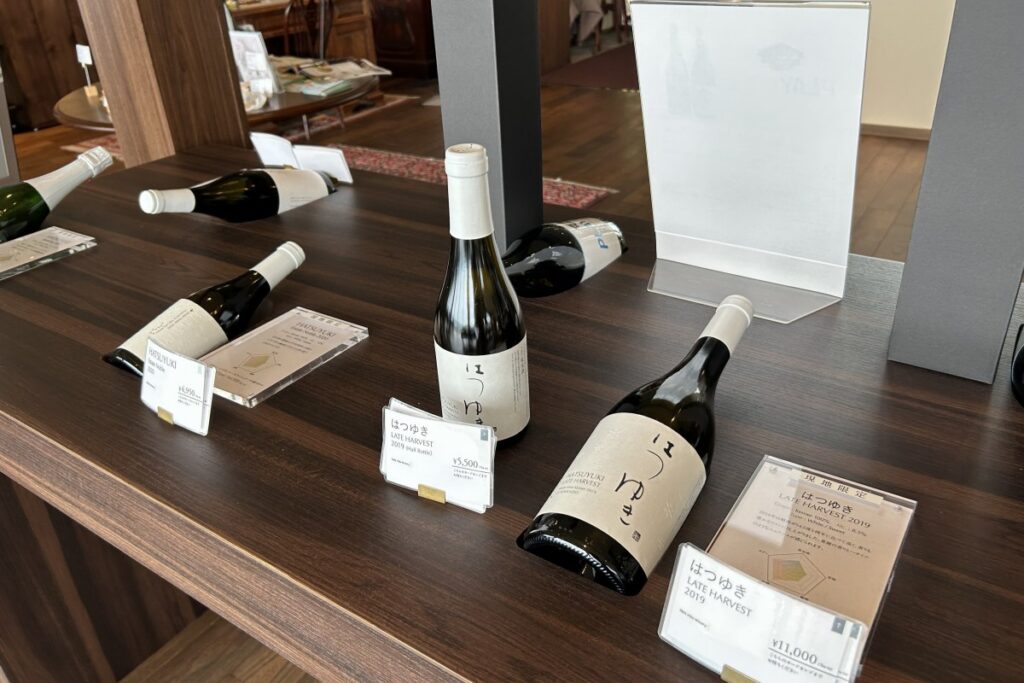 ショップではフラッグシップワインの白「HATSUYUKI」のほか、HATSUYUKIのスパークリング、華やかな香りの白「NEIRO」、世界最大規模のワインコンクールで日本の赤ワインとして初めて金賞を受けた「YUHZOME」などのほか、テイスティンググラスやワインオープナーなども扱っています。